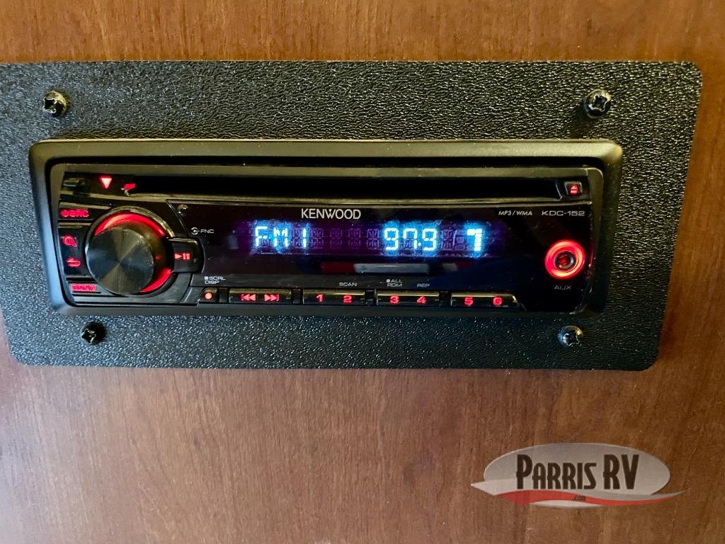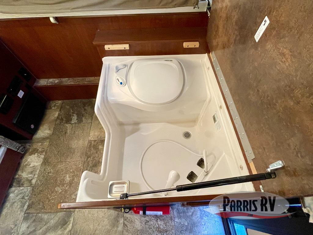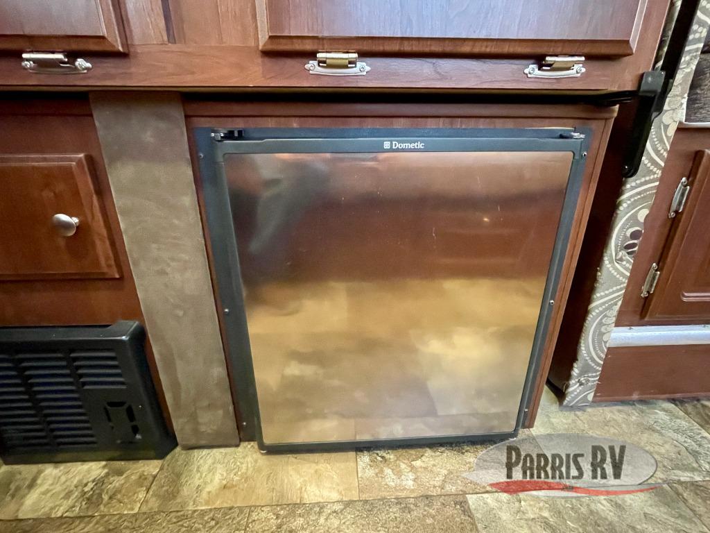 As you continue around, a 72" x 50" booth dinette is located within the single slide out. Back inside, one back corner provides a swing level galley with a cabinet, three burner range top and single bowl sink. An optional refrigerator is under the three burner range.