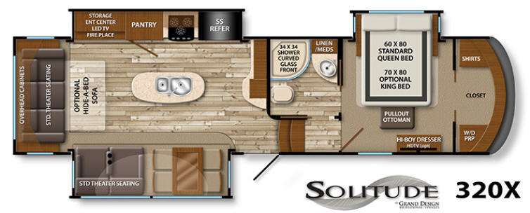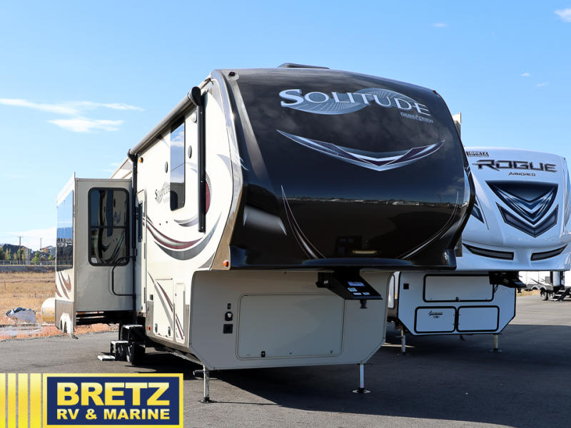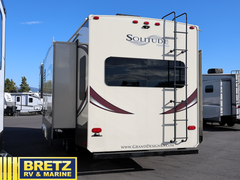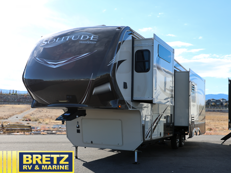 The Grand Design Solitude X-Series fifth wheel model 320X is just what you need to enjoy spending time away from home. This unit features a rear living layout, triple slides for added interior space, and a convenient kitchen island, plus so much more!