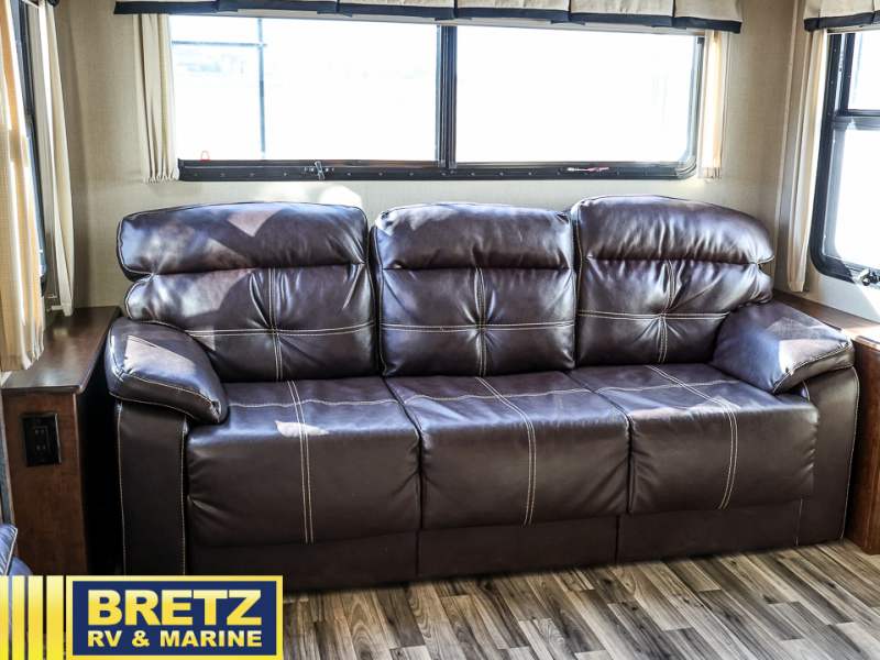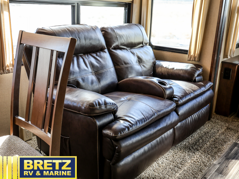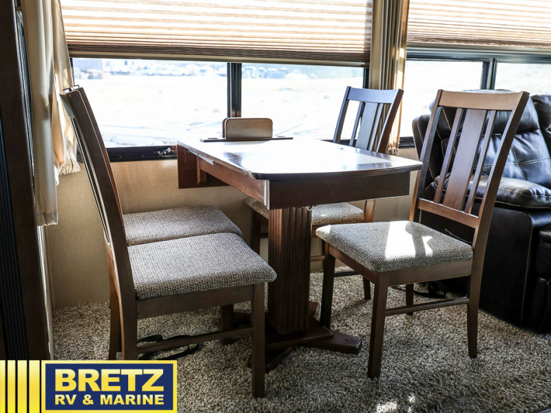 Step inside and be greeted by a wide open space with dual opposing slides in the main living area. There is a free standing dinette and theater seating for two to the left of the entry door in a slide out that provides even more walking around space.