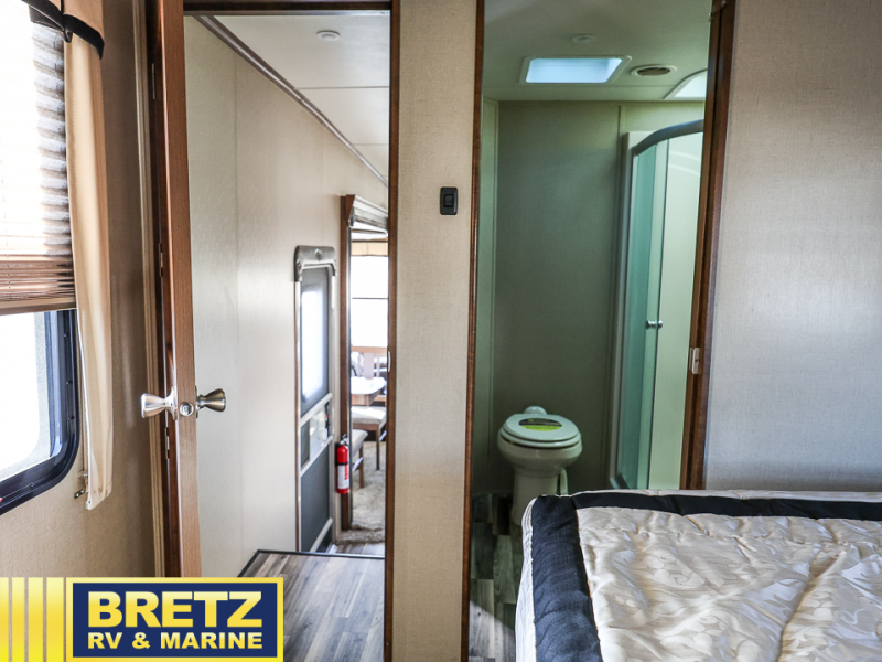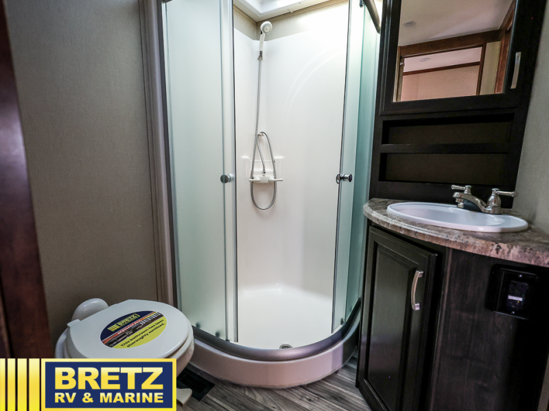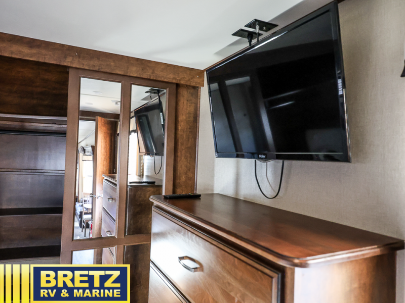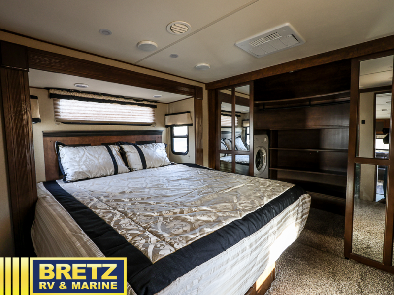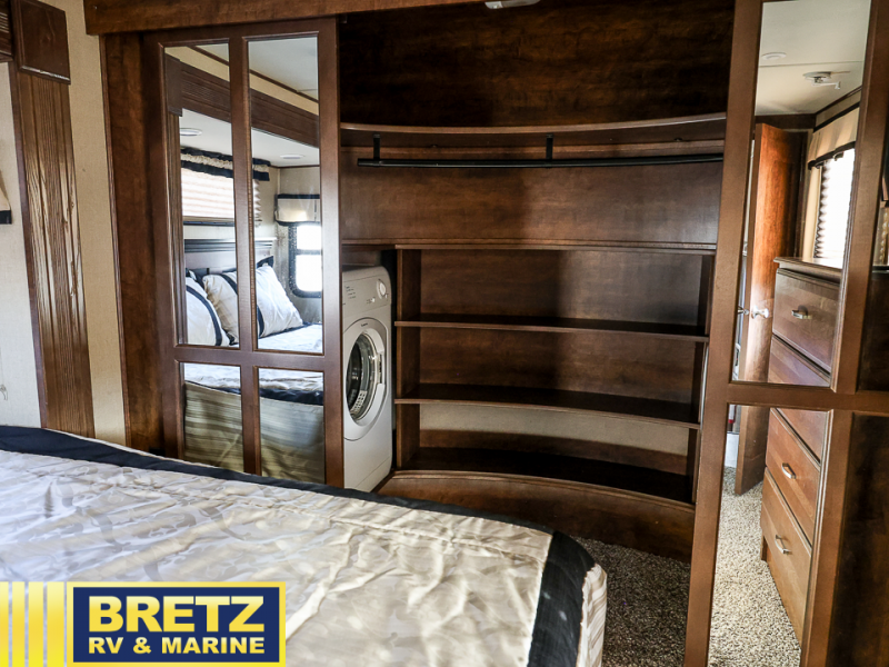 The private master bedroom provides a slide out queen size bed, or you can opt. for the king size if you like a bit more sleeping space. There is a pull out ottoman at the foot of the bed, and a hi-boy dresser along the opposite wall with optional TV. A full front closet provides ample space to store your clothes, and features a space prepped for a washer and dryer on one end, plus so much more!