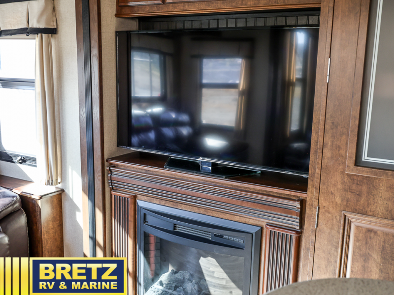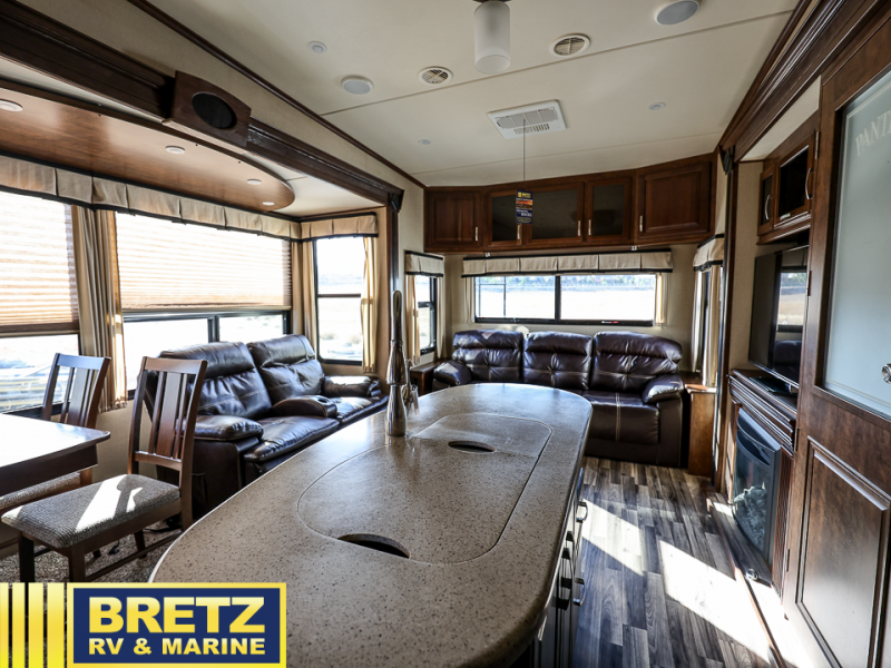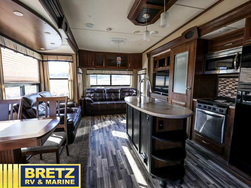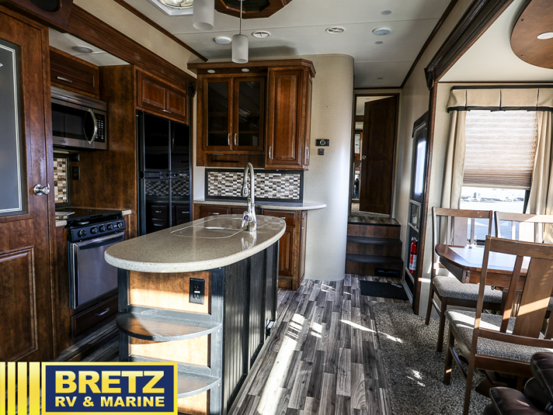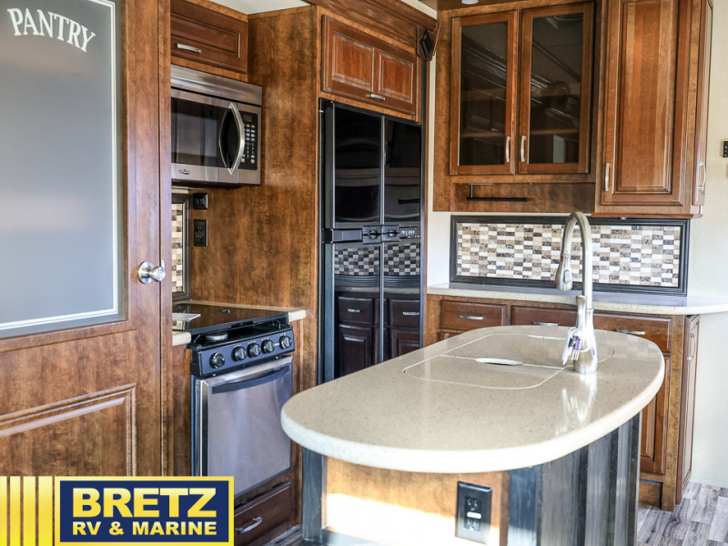 The slide opposite the door features an entertainment center with LED TV and fireplace, plus storage. The slide also includes a pantry, three burner range, and side-by-side refrigerator. Along the interior living area wall there is counter space with storage both above and below. You will also love the extra counter prep space found on the kitchen island along with a double sink.