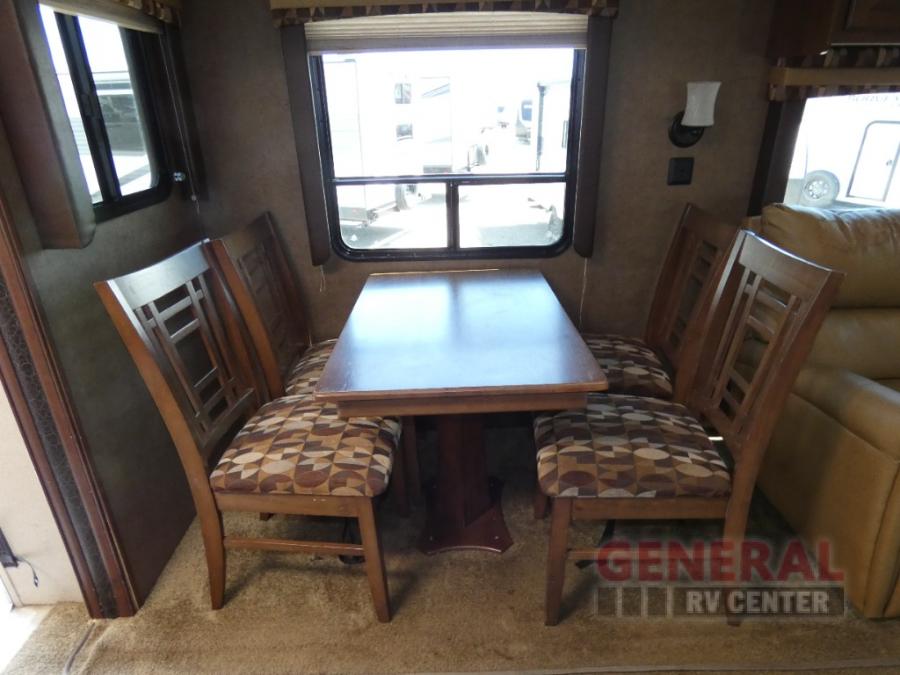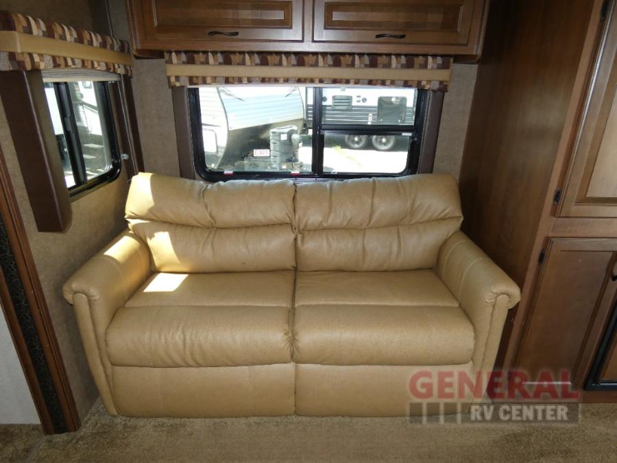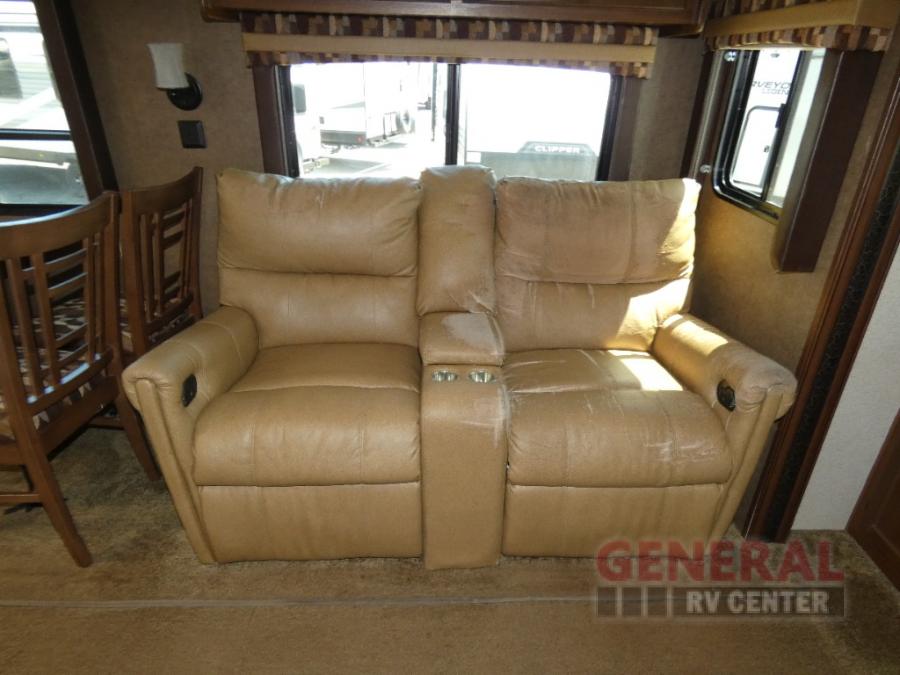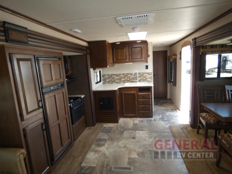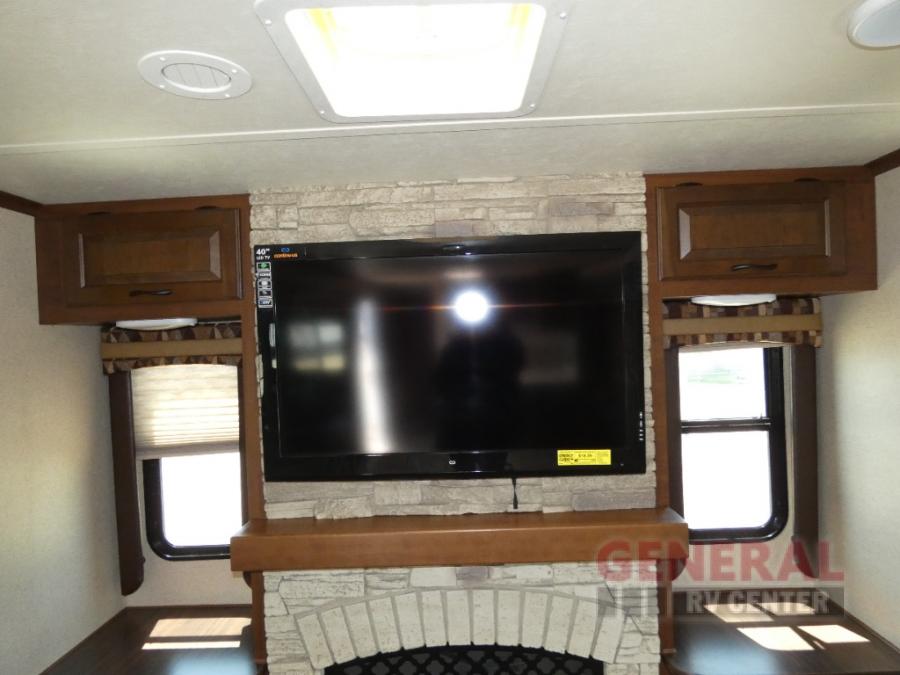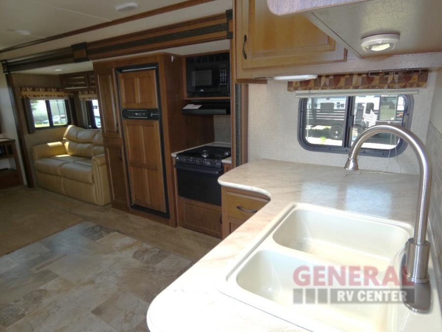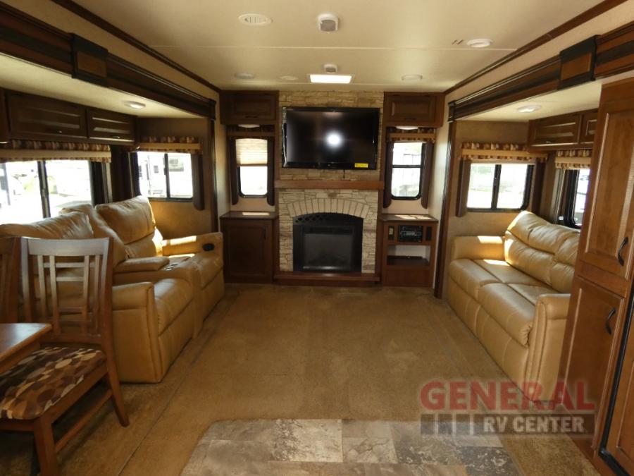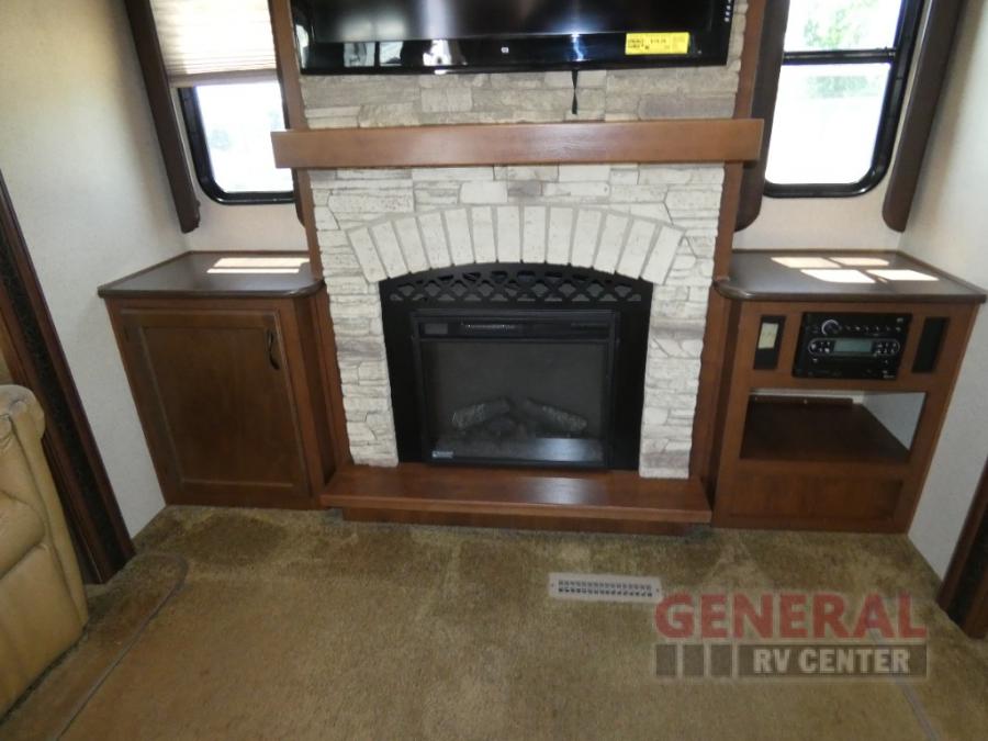 The kitchen and main living area offer two slides, the first slide has a dinette and sofa. The other slide has a sofa, pantry, refrigerator, and three burner range. There is a l-shaped counter with a double kitchen sink. Located along the rear wall is a full wall entertainment center with fireplace that you are sure to enjoy!