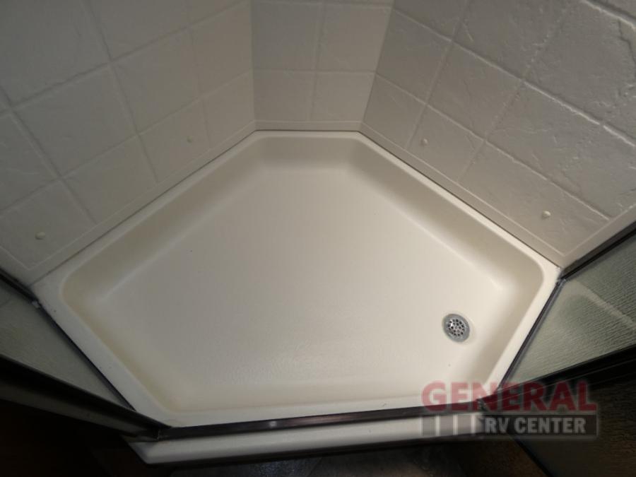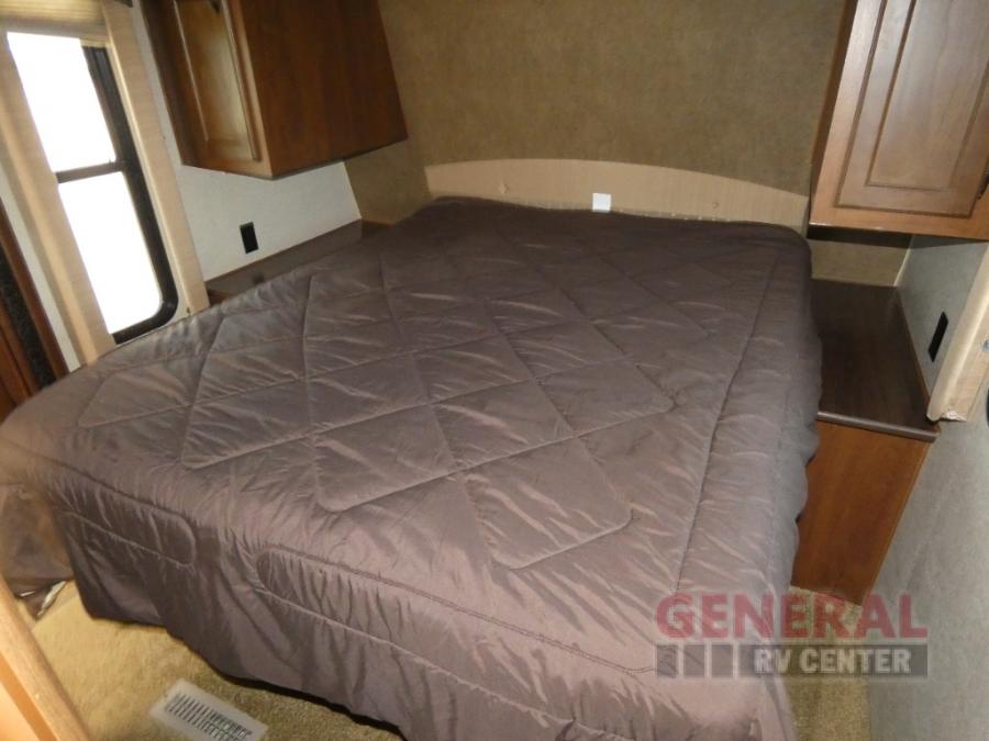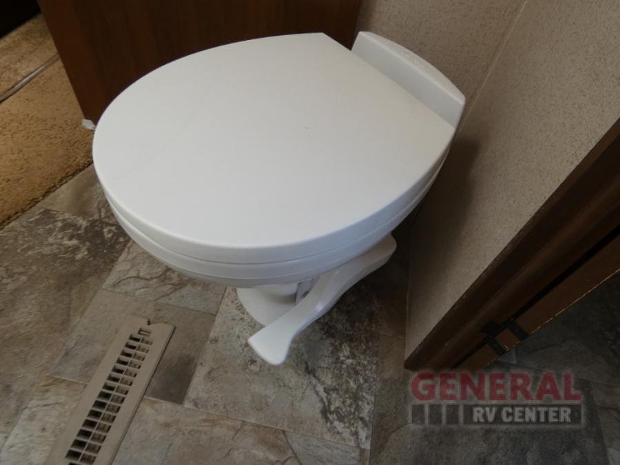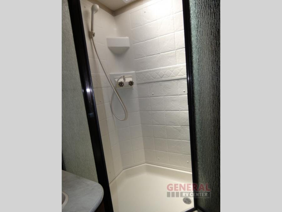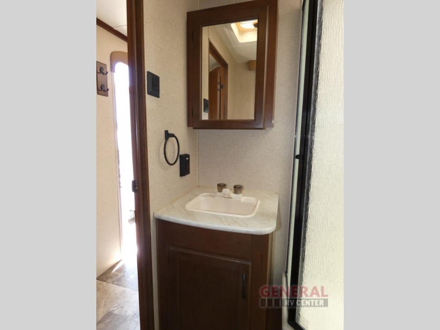 As you enter this travel trailer, the bathroom and bedroom are to your right. Inside the bath, you will find a sink, medicine cabinet, corner shower and toilet. You can walk thru the bathroom into the bedroom. The bedroom has a linen and wardrobe slide for added space. There is a comfortable queen bed and two wardrobes, one on either side of the bed.