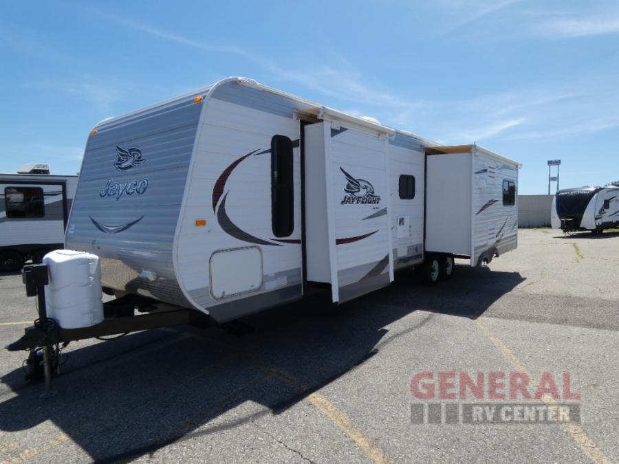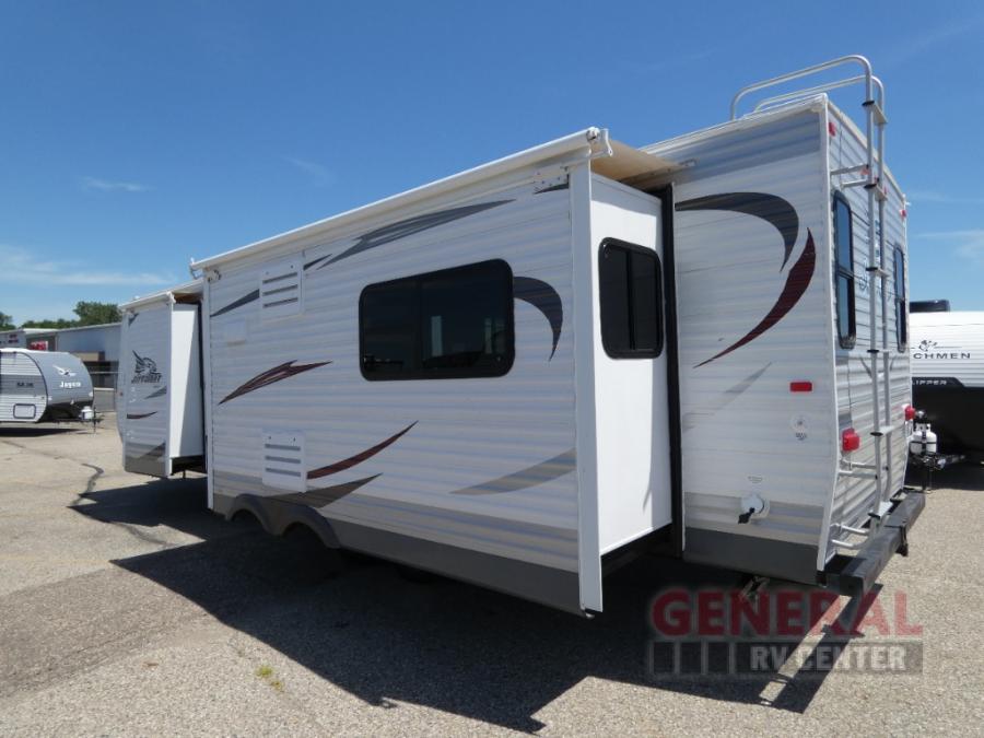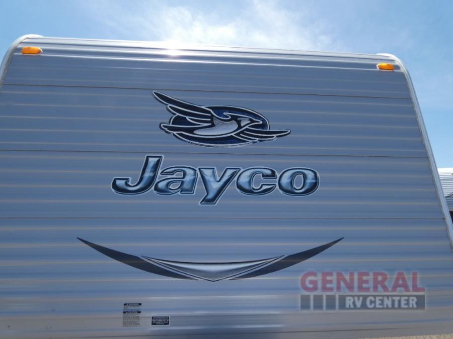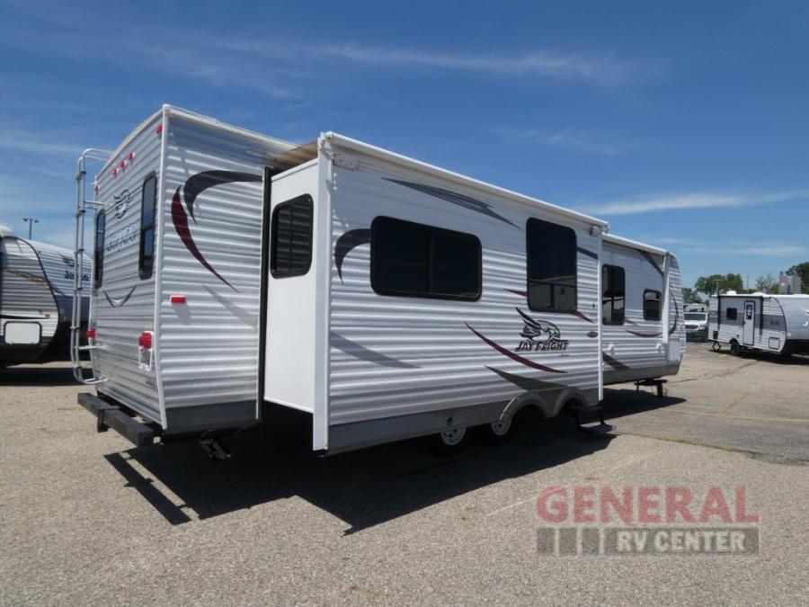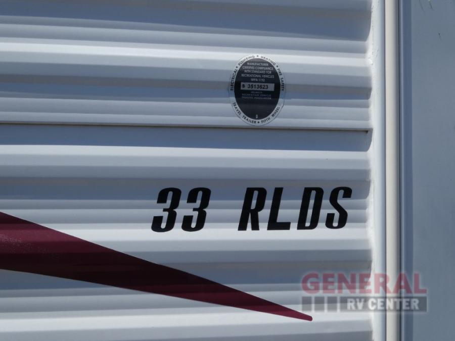 The 33RLDS Jay Flight travel trailer by Jayco offers triple slides and a rear entertainment center.