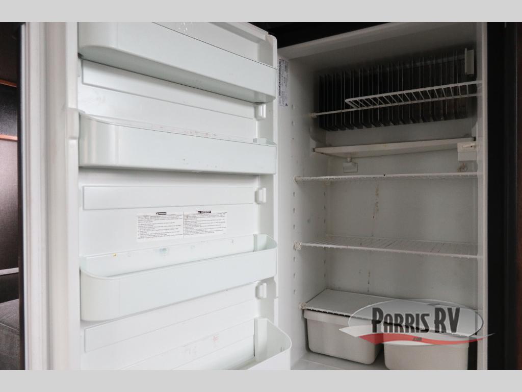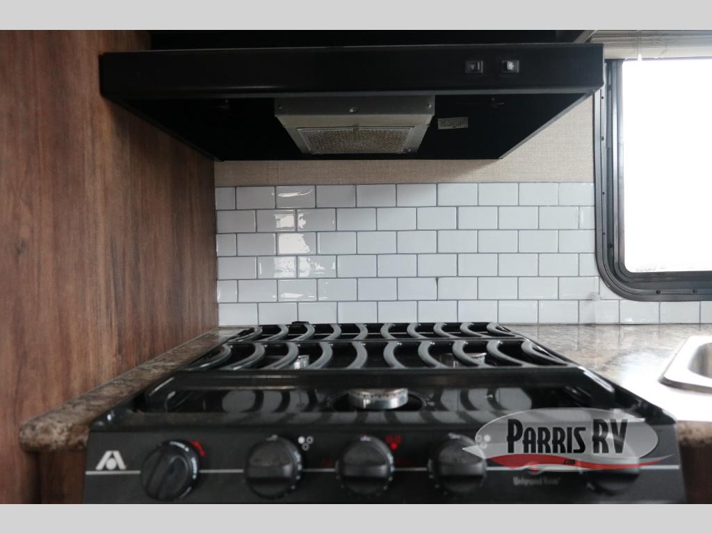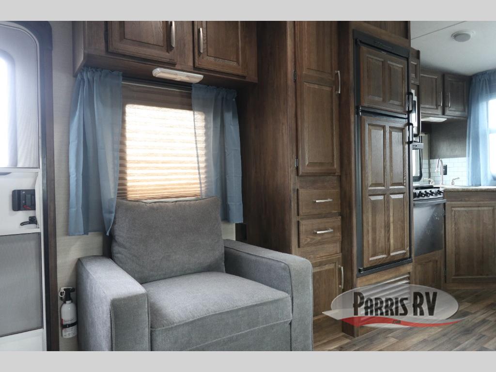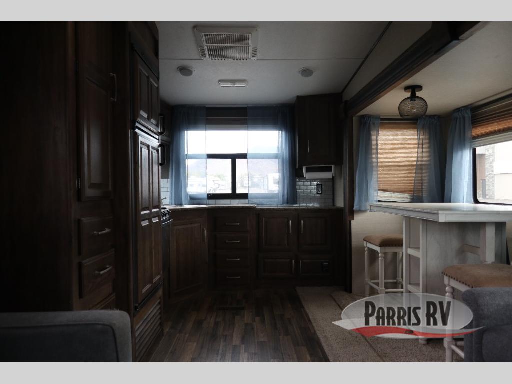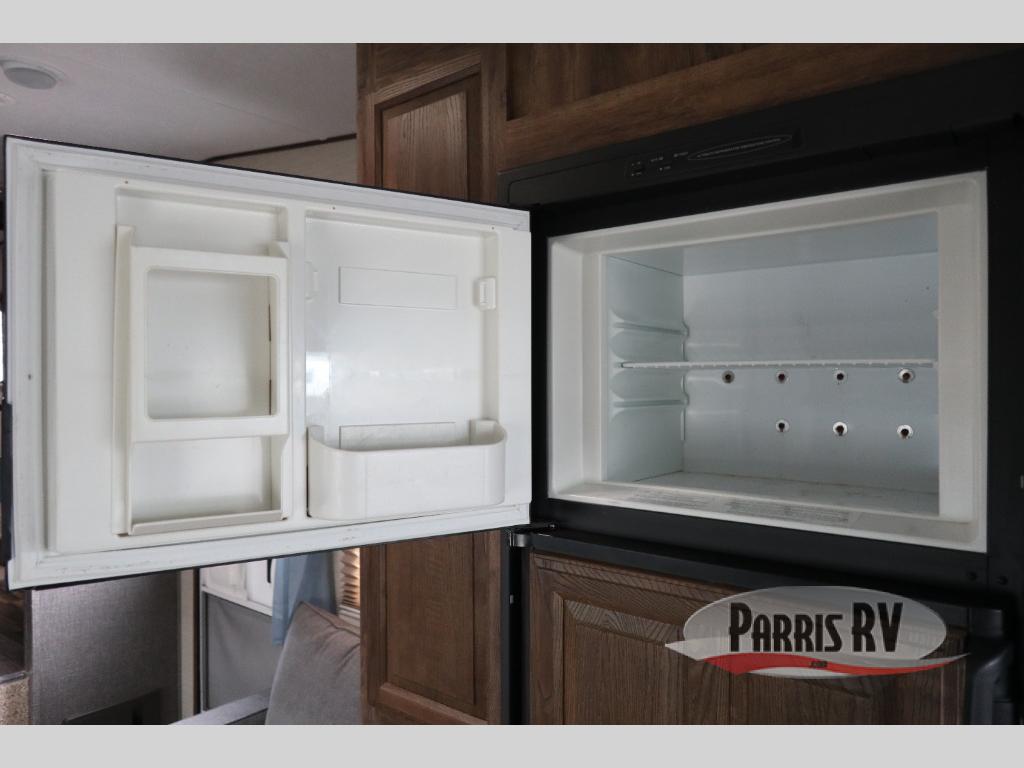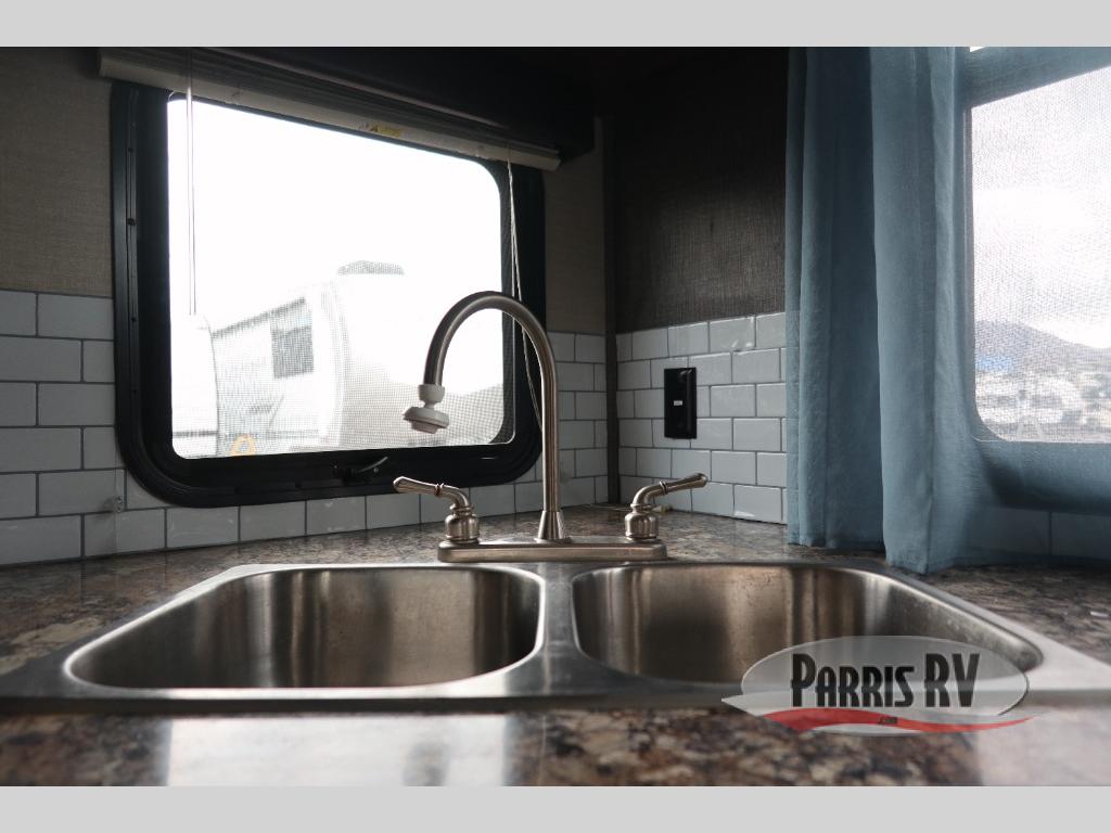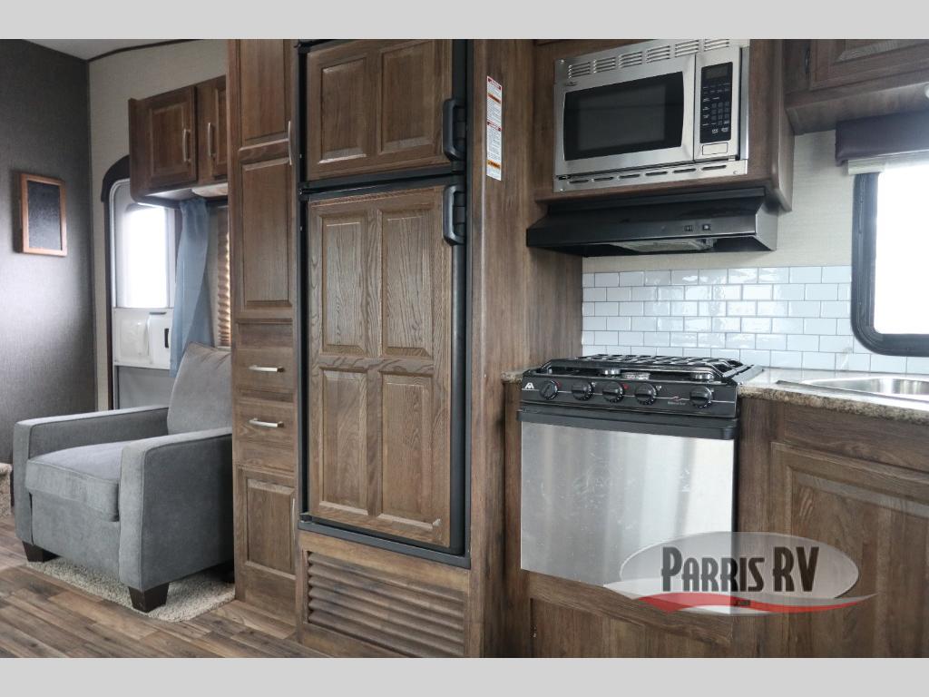 Find a rear kitchen layout in the back left corner providing ample equipment to prepare and cook all of your family's favorite meals and snacks. Starting with a pantry for storage next to the rocker recliner. Next, find a refrigerator and three burner range. As you round the back corner you will find a double kitchen sink and plenty of counter space for prep work and more. There are plenty of drawers and lower cupboards for dishes, pots and pans and silverware to be stored.