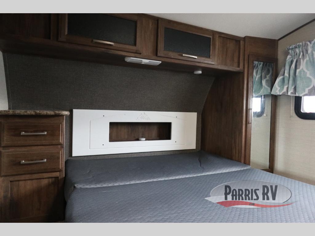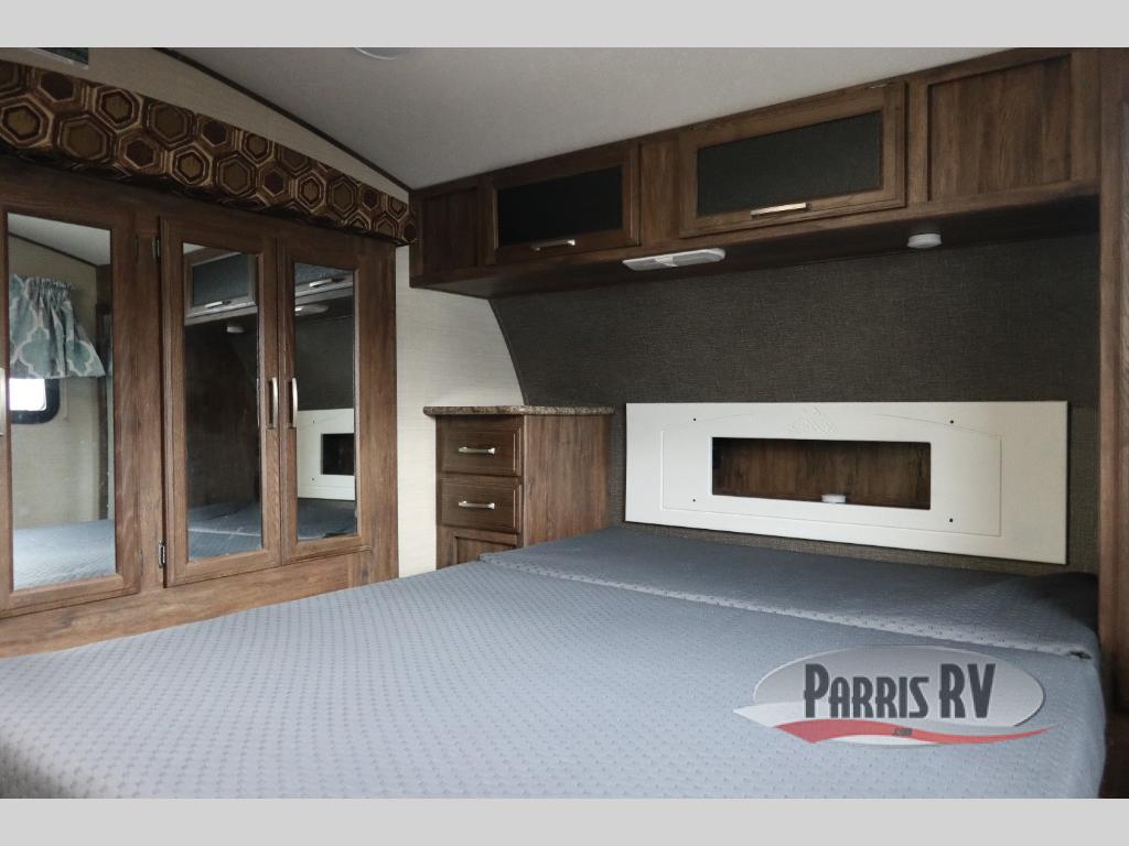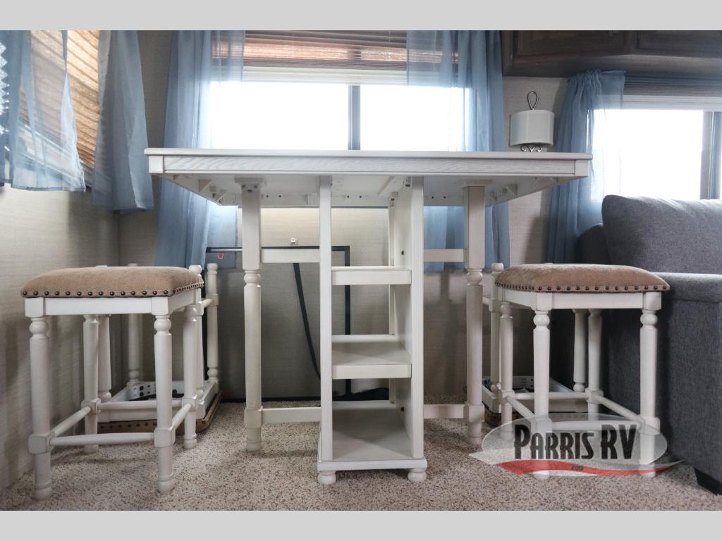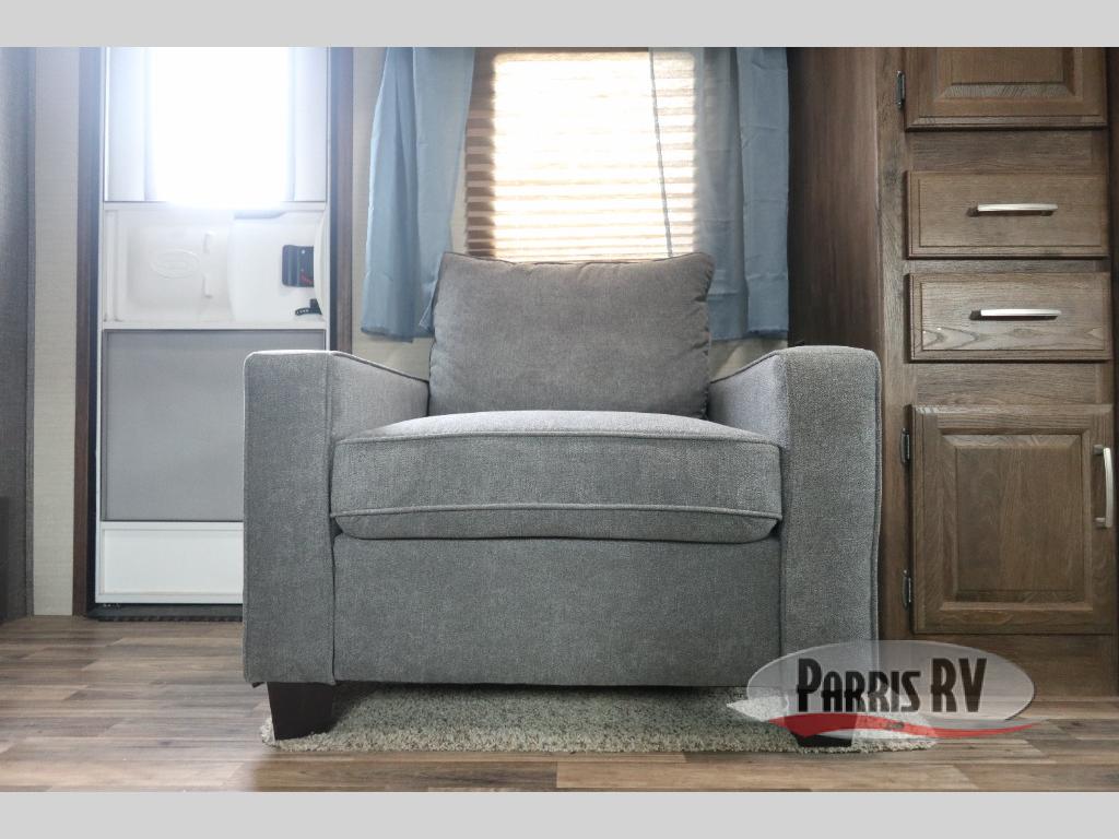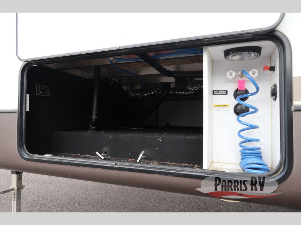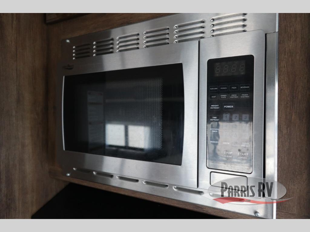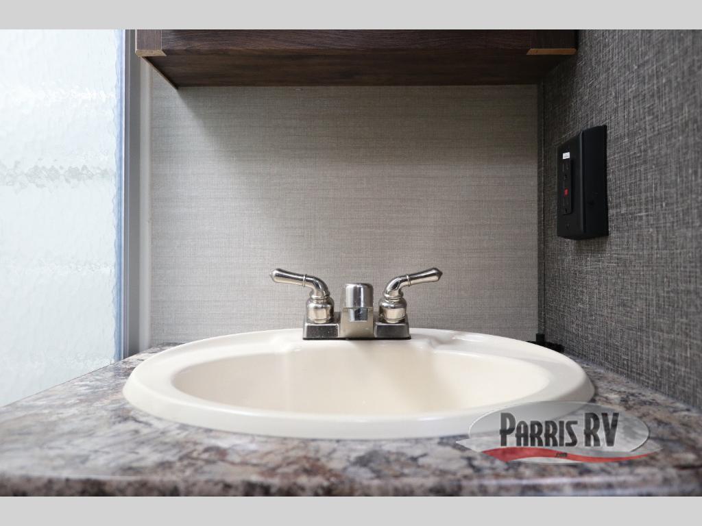 Find a rear kitchen layout in the back left corner providing ample equipment to prepare and cook all of your family's favorite meals and snacks. Starting with a pantry for storage next to the rocker recliner. Next, find a refrigerator and three burner range. As you round the back corner you will find a double kitchen sink and plenty of counter space for prep work and more. There are plenty of drawers and lower cupboards for dishes, pots and pans and silverware to be stored.