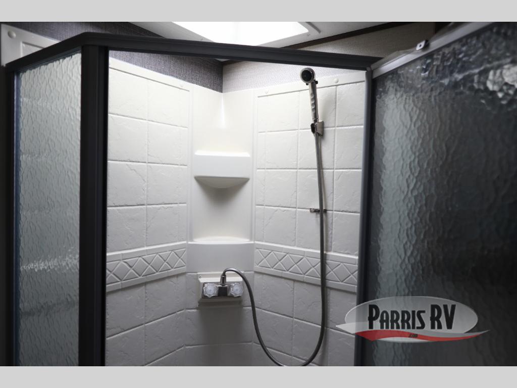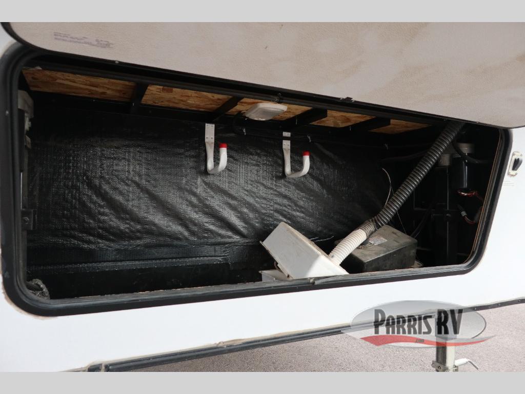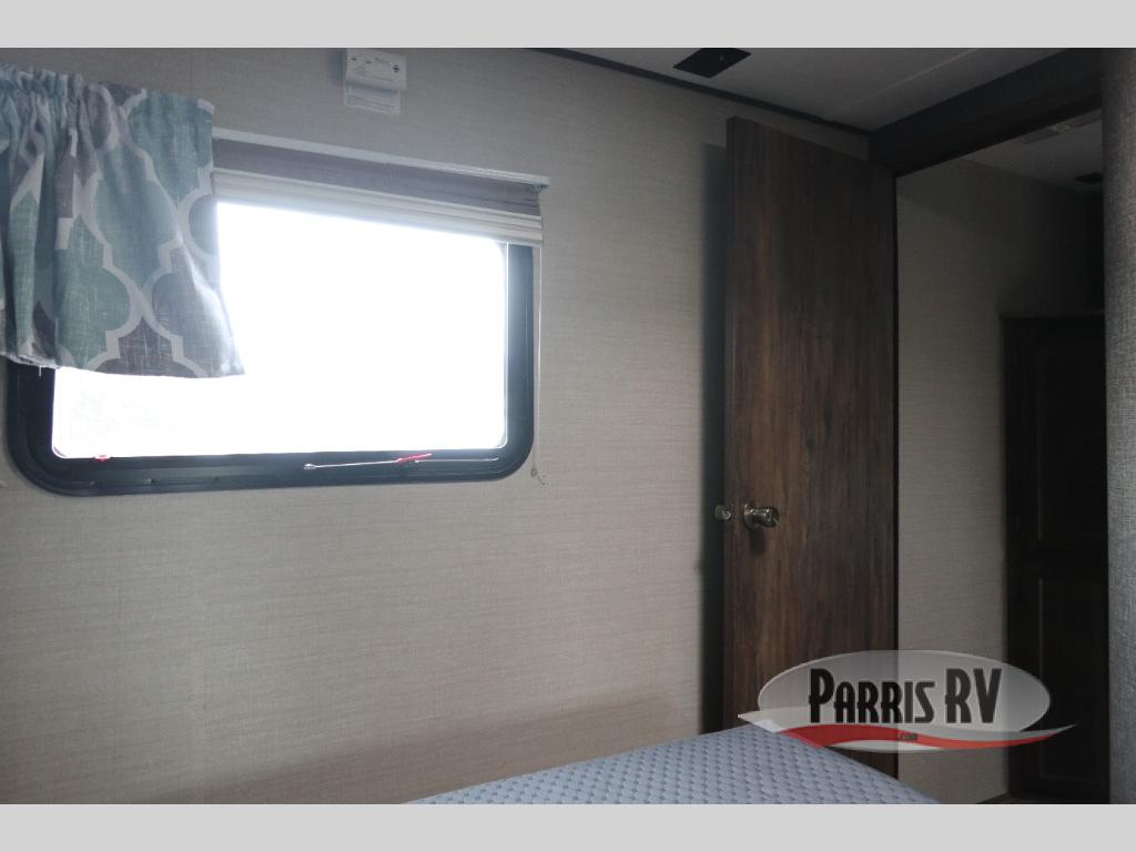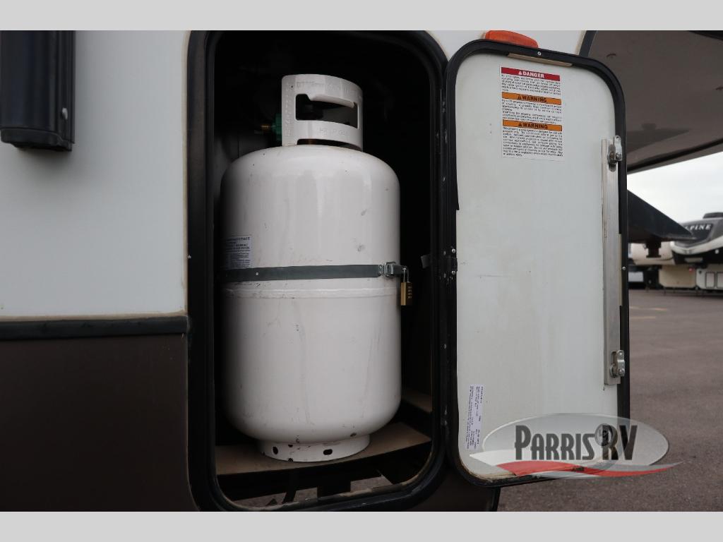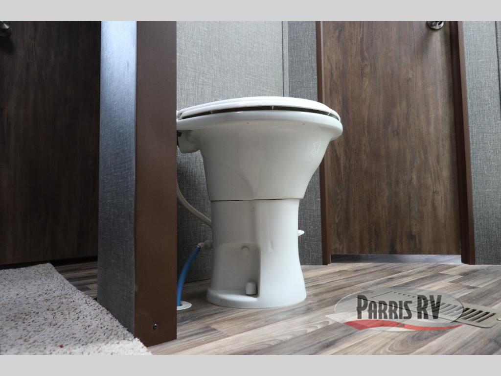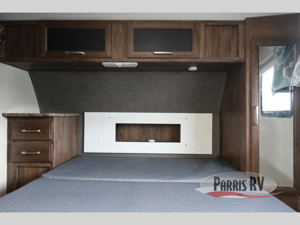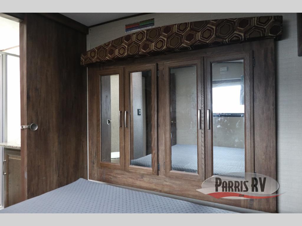 Find a rear kitchen layout in the back left corner providing ample equipment to prepare and cook all of your family's favorite meals and snacks. Starting with a pantry for storage next to the rocker recliner. Next, find a refrigerator and three burner range. As you round the back corner you will find a double kitchen sink and plenty of counter space for prep work and more. There are plenty of drawers and lower cupboards for dishes, pots and pans and silverware to be stored.