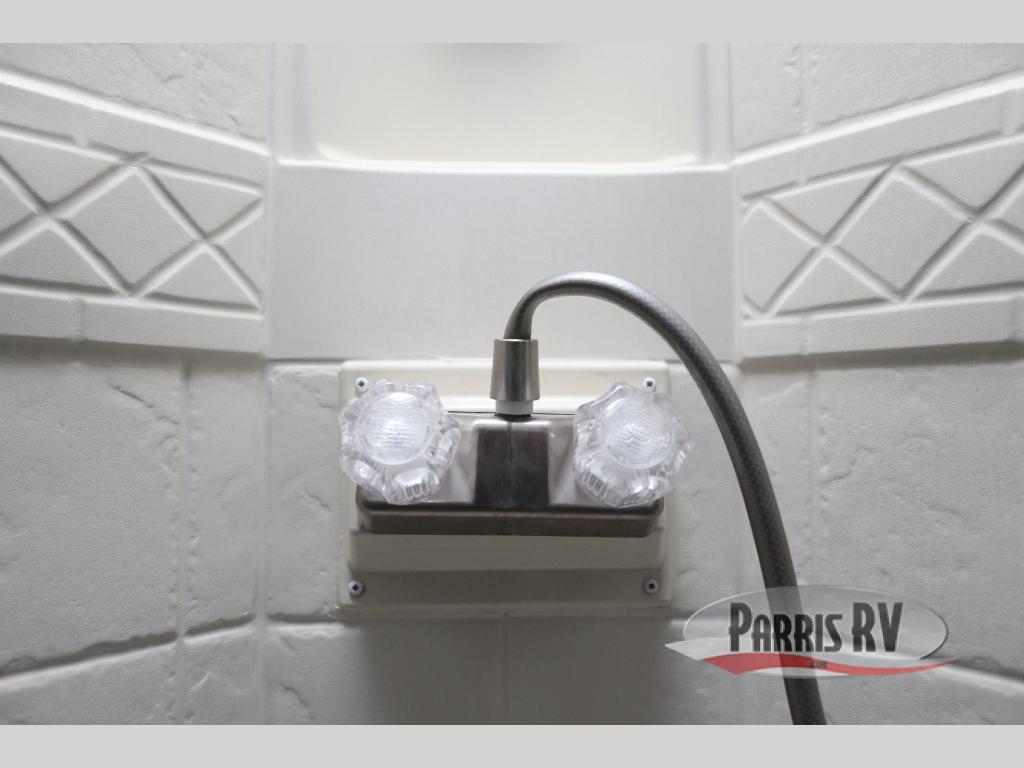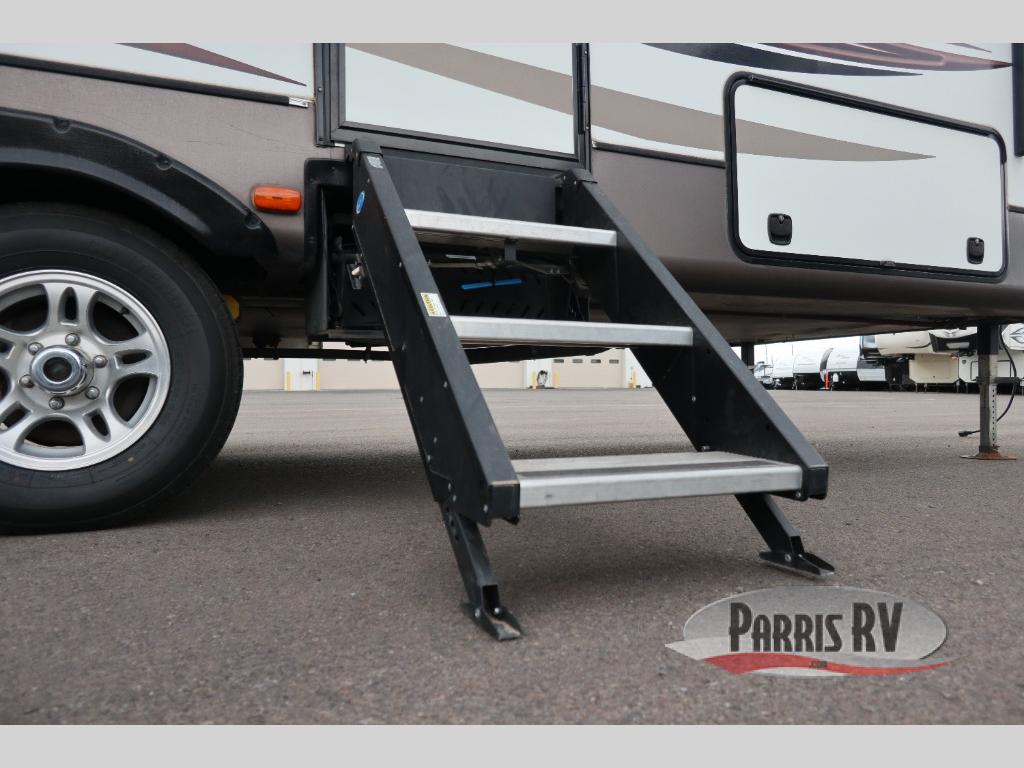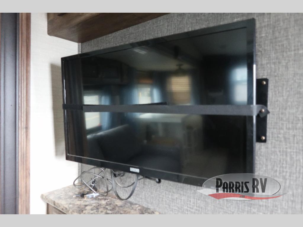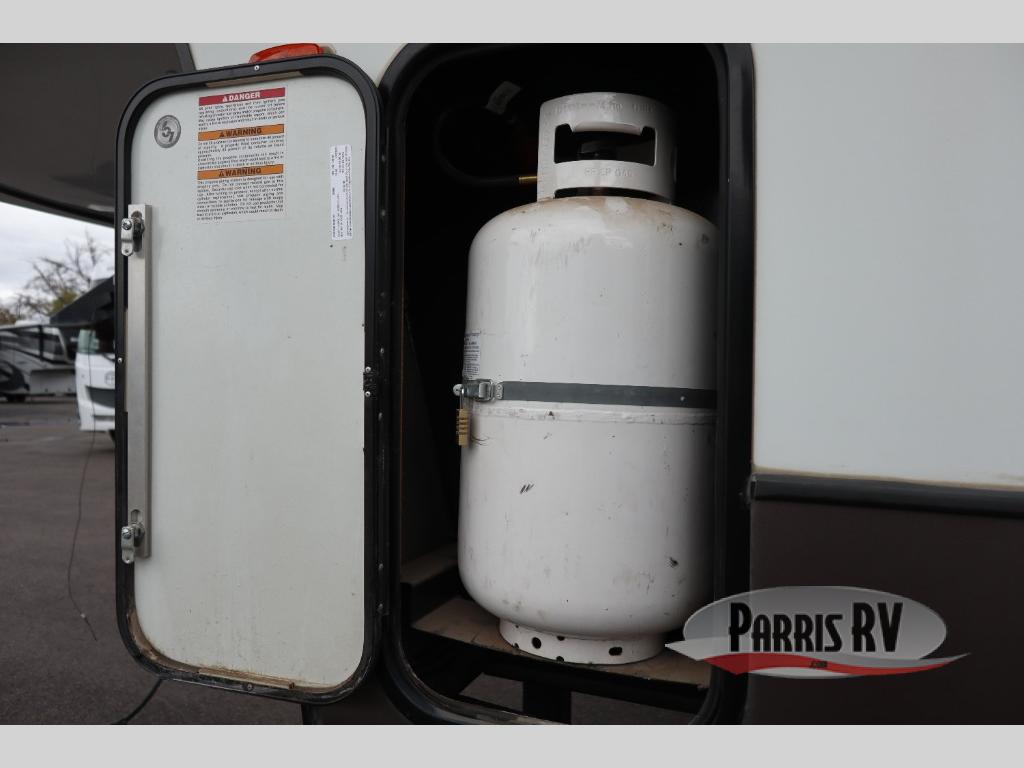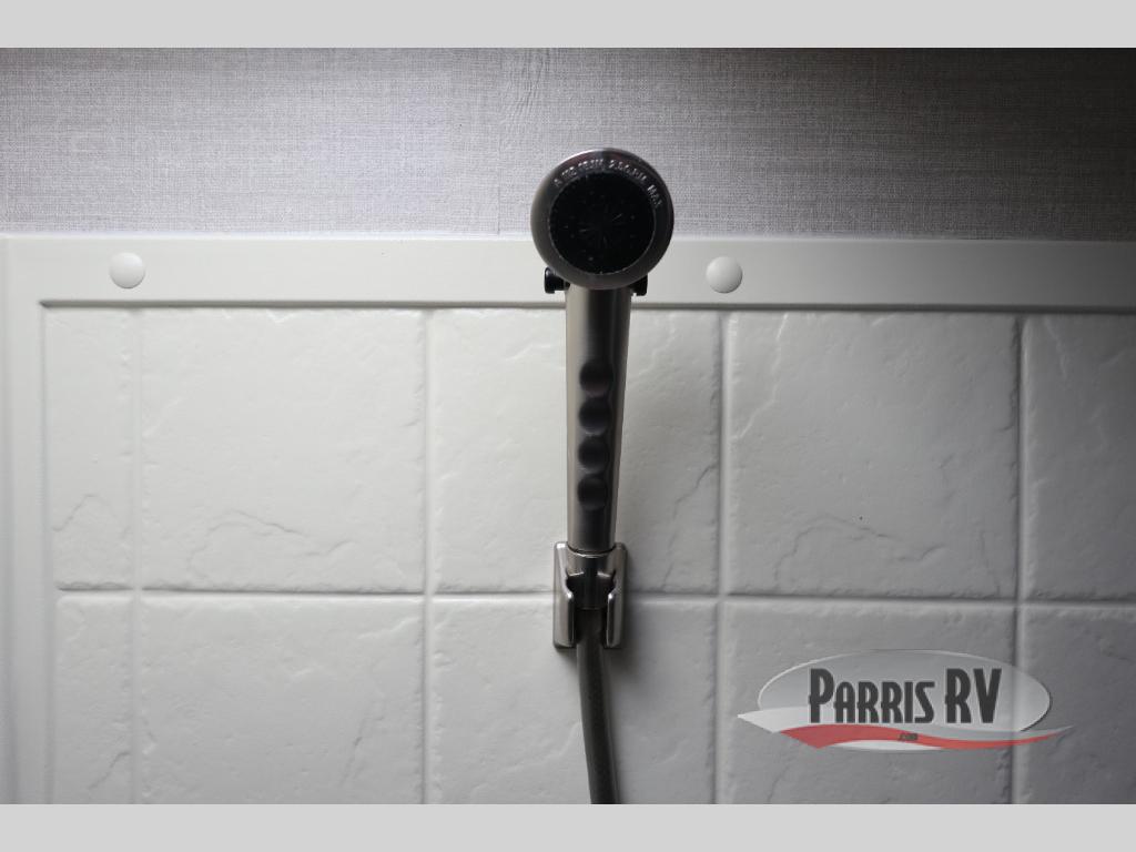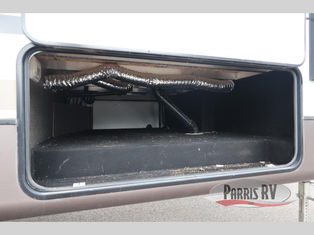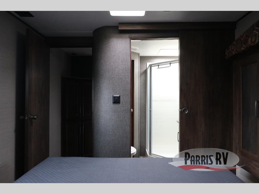Find a rear kitchen layout in the back left corner providing ample equipment to prepare and cook all of your family's favorite meals and snacks. Starting with a pantry for storage next to the rocker recliner. Next, find a refrigerator and three burner range. As you round the back corner you will find a double kitchen sink and plenty of counter space for prep work and more. There are plenty of drawers and lower cupboards for dishes, pots and pans and silverware to be stored.