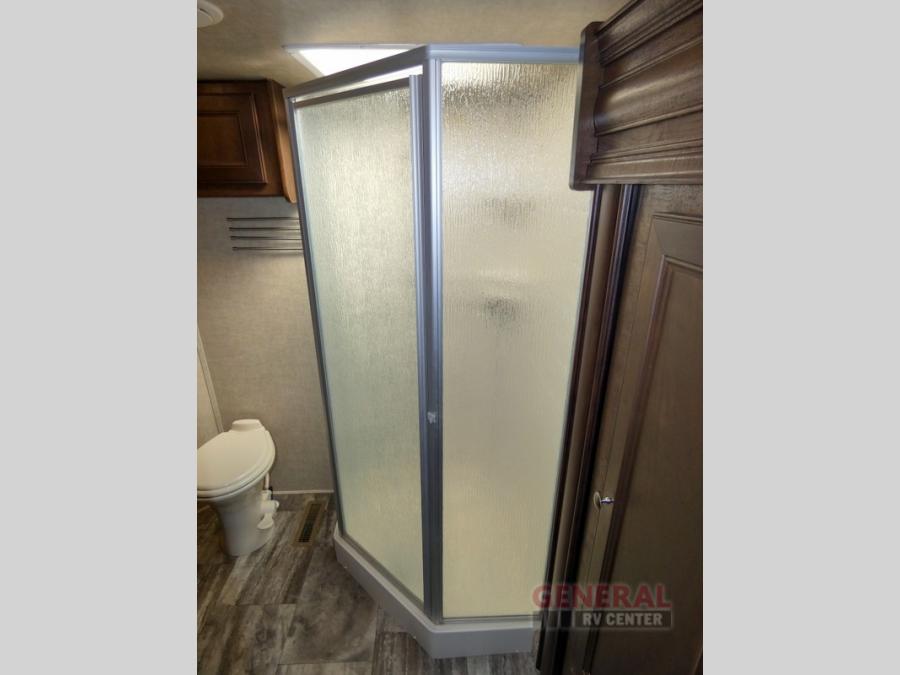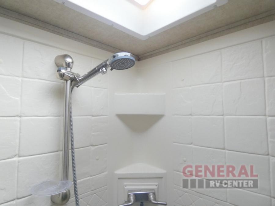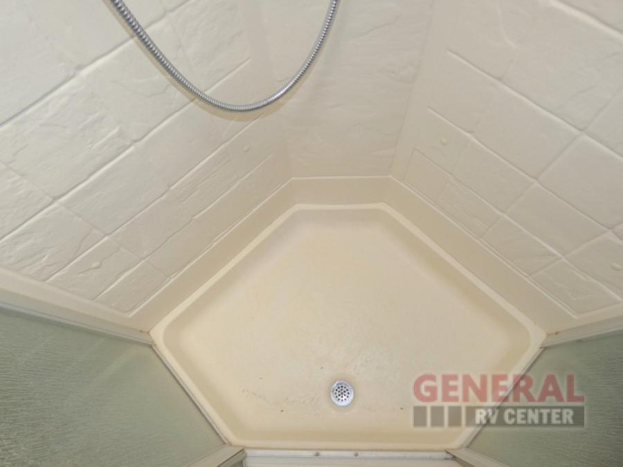 Head up the steps to the right of the main entry door and find a side aisle bath with angled shower, toilet, and vanity with sink. A second sliding bath door inside allows access to linens within the bedroom wardrobe/linen cabinet slide out.