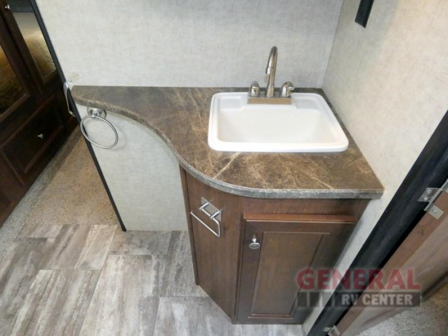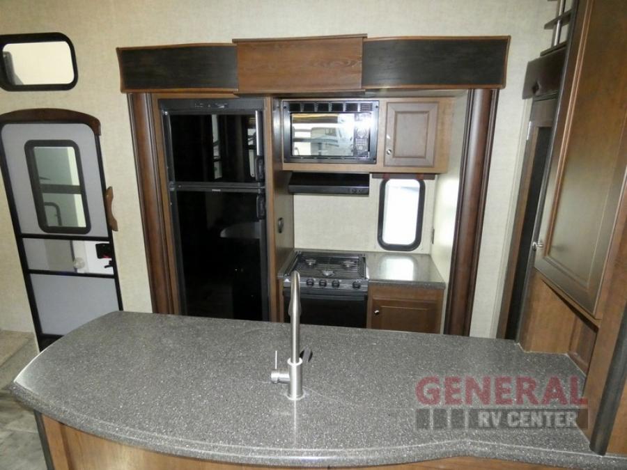 Head through the door to the living area up front, or use the main side entry and find yourself in the combined kitchen and living room space. There is a slide out 8 cu. ft. refrigerator and three burner range to your immediate left as you walk in. Just off that slide is a pantry for all of your food storage needs. A counter peninsula offers a space to prep food and a double sink, plus storage.
