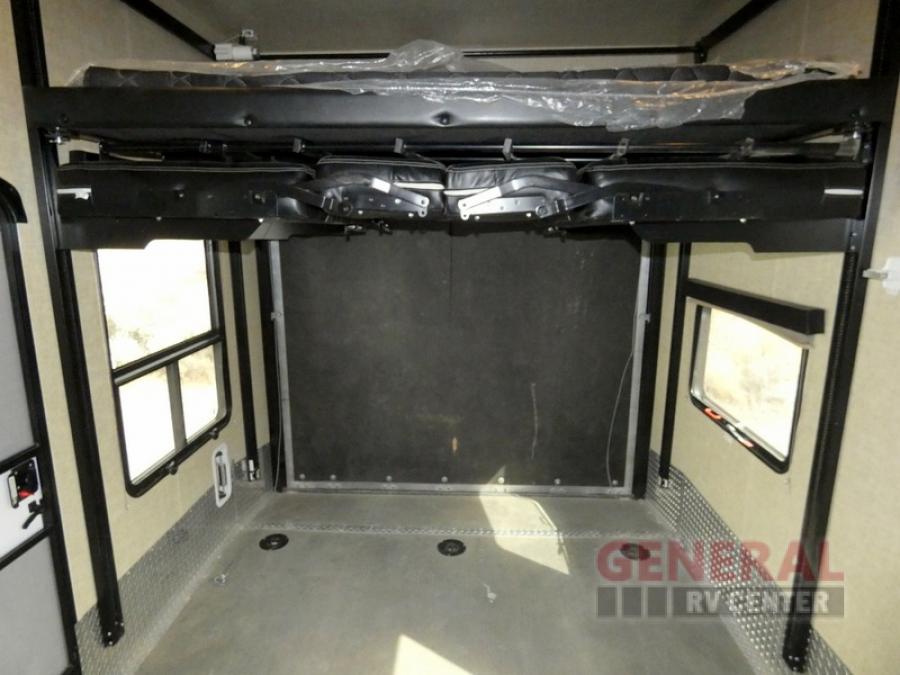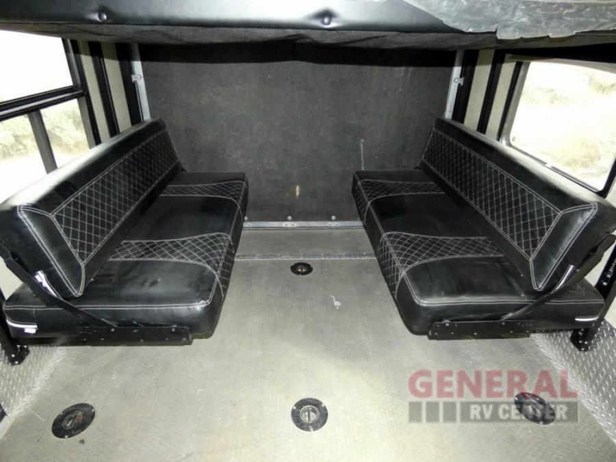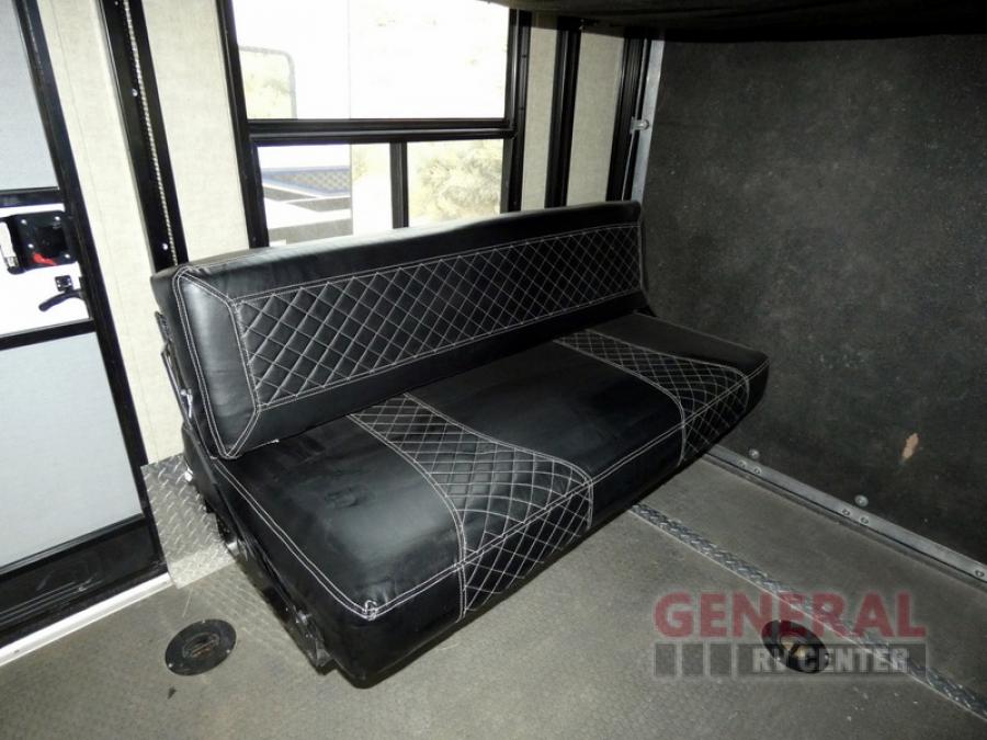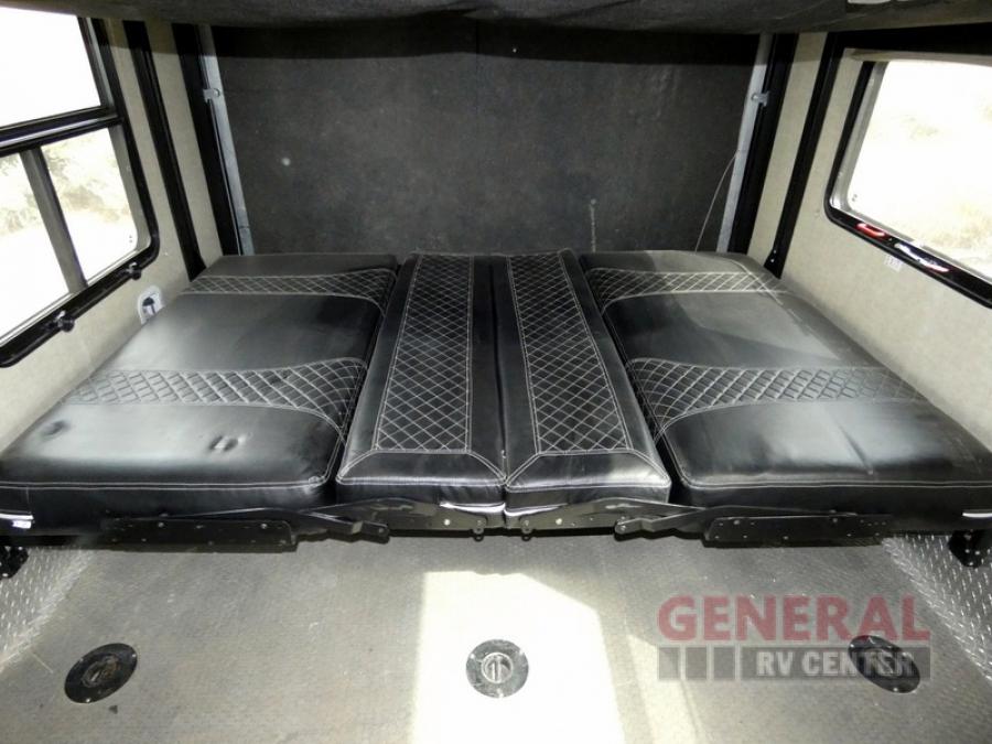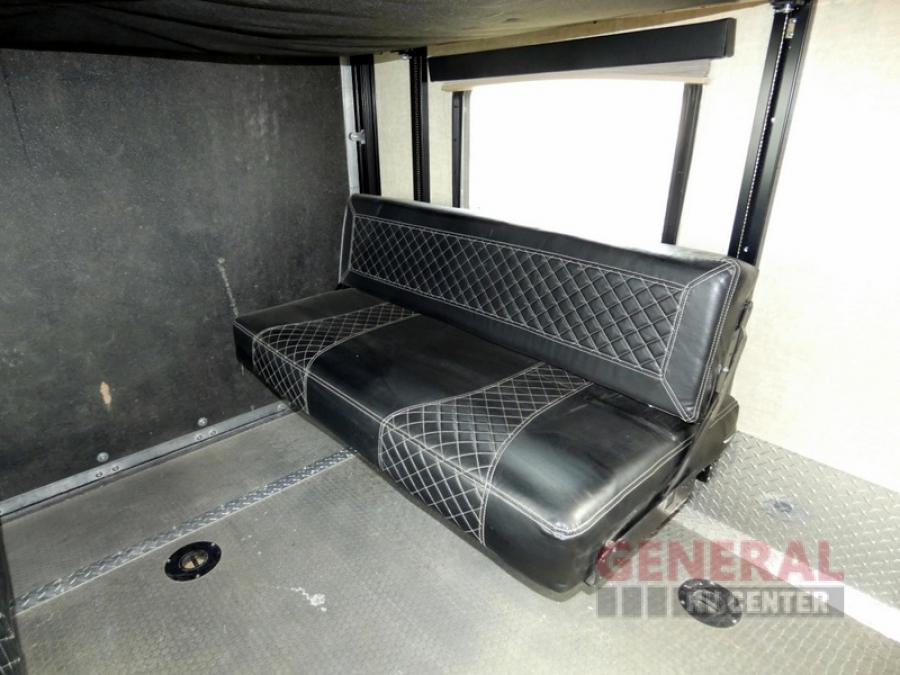 In the cargo you will also find overhead cabinets, and a single loft bed, TV prep, and dual opposing sofas with a top queen bed that stores neatly up to the ceiling when not in use. Once you are parked and the toys are removed you can lower the dual sofas and create a whole additional living space to use.