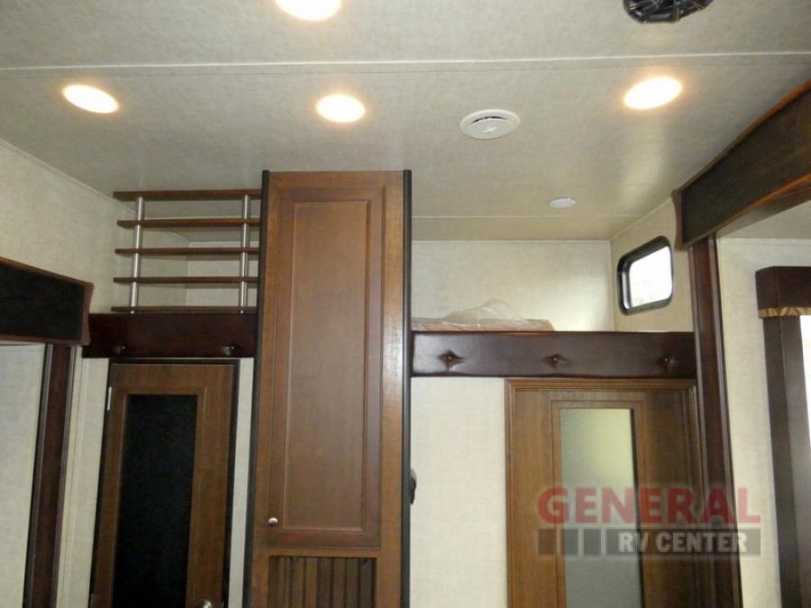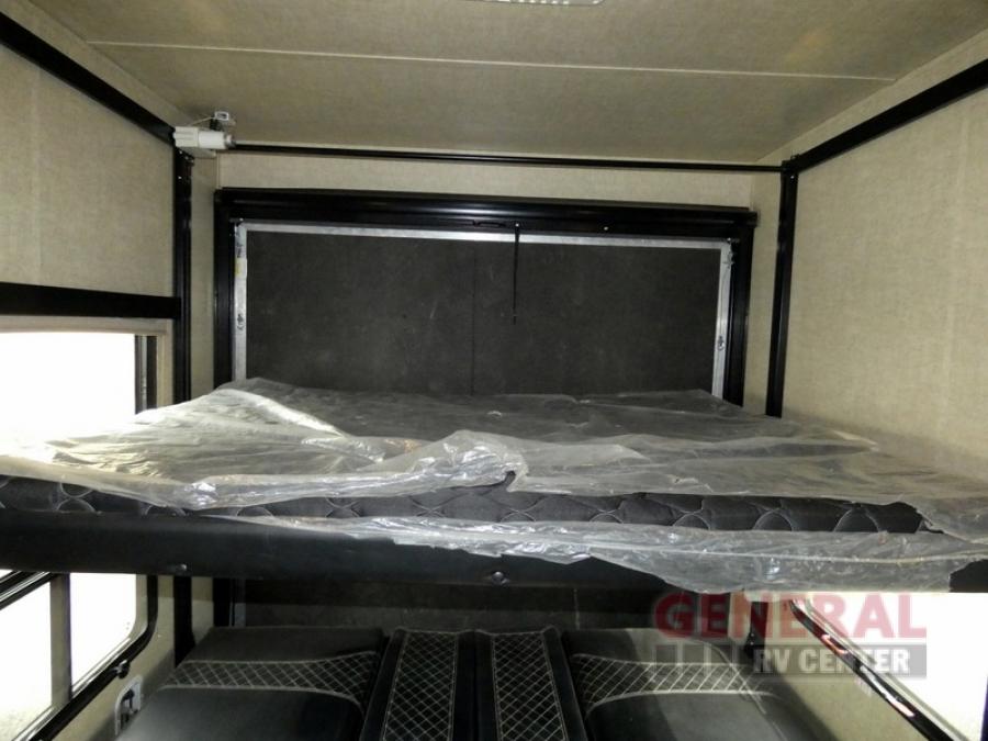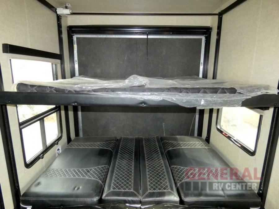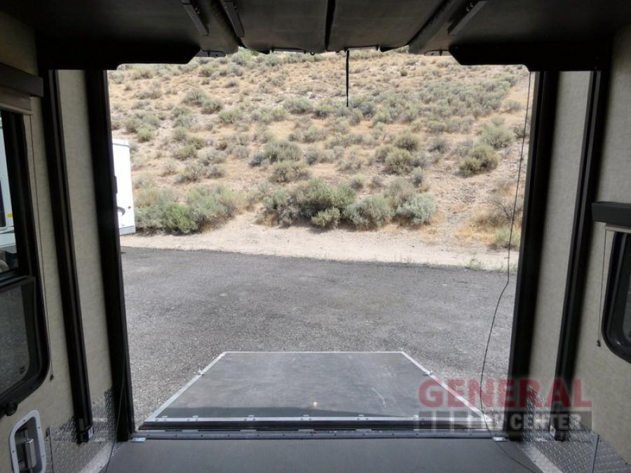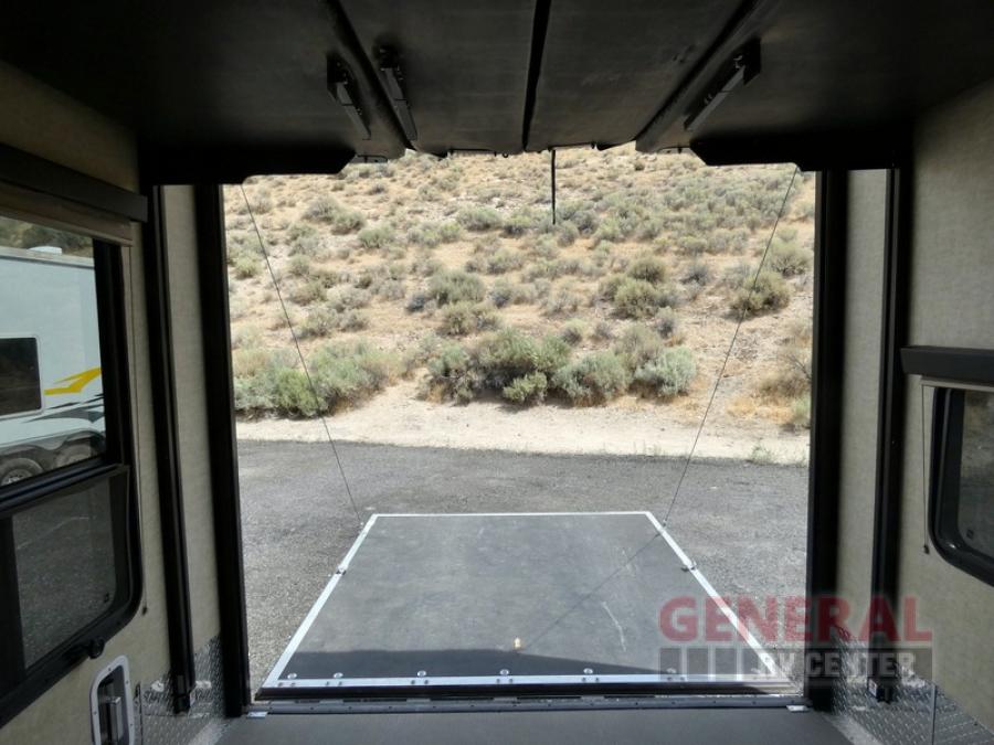 In the cargo you will also find overhead cabinets, and a single loft bed, TV prep, and dual opposing sofas with a top queen bed that stores neatly up to the ceiling when not in use. Once you are parked and the toys are removed you can lower the dual sofas and create a whole additional living space to use.