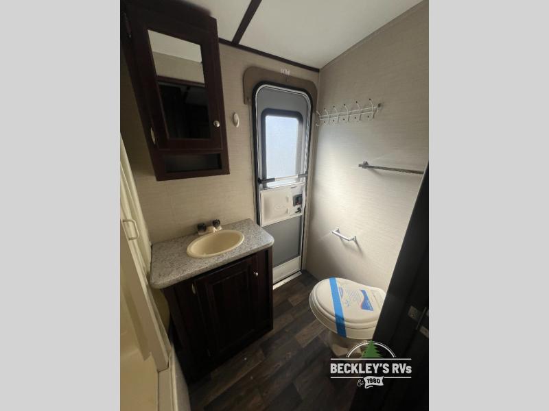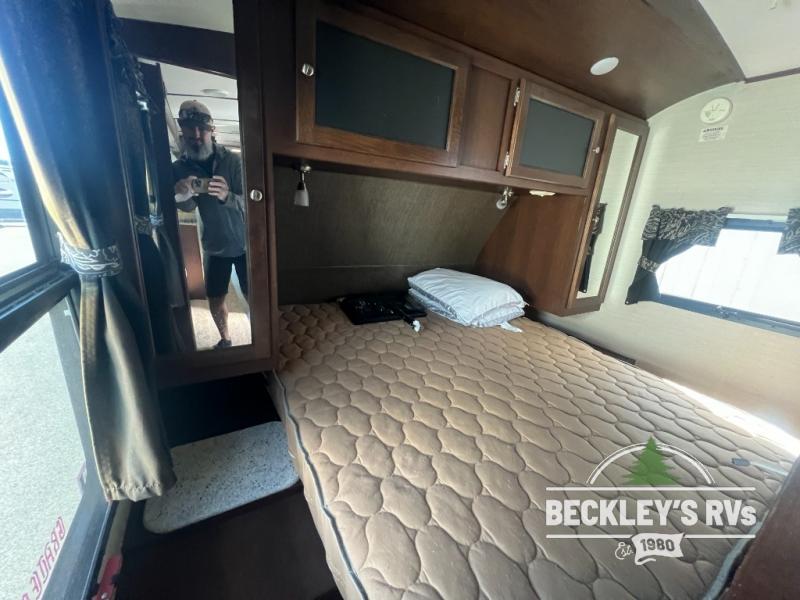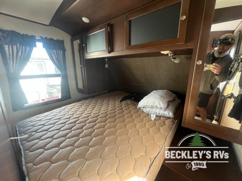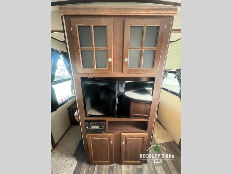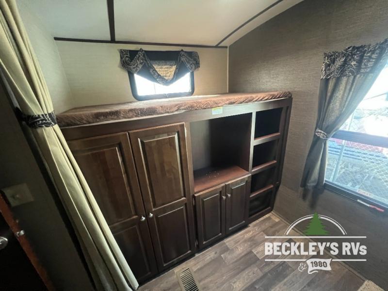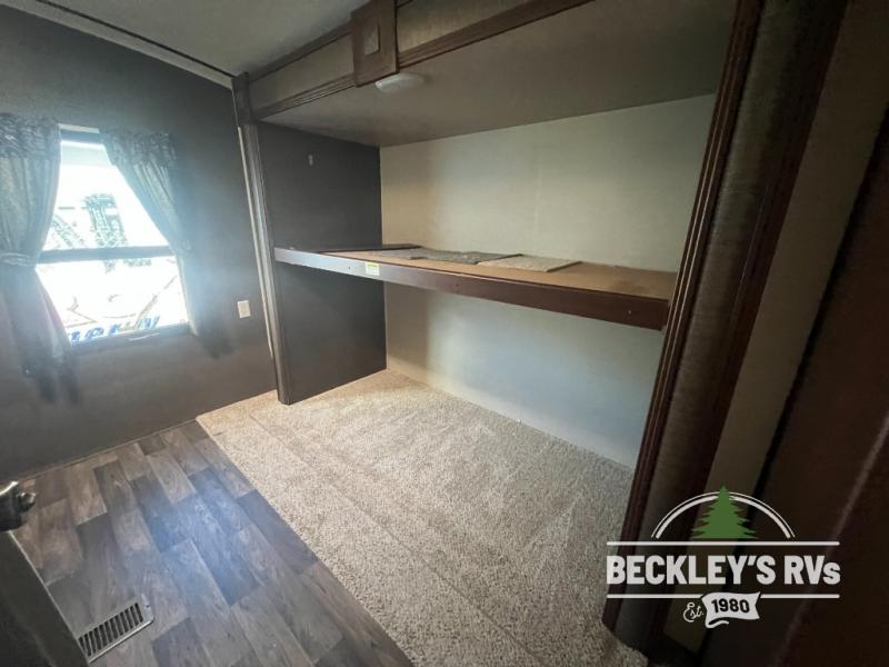 The rear bunkhouse provides sleeping for four with a slide out bunk bed including trundle below and a fourth bunk above the entertainment center wardrobe area on the opposite side.