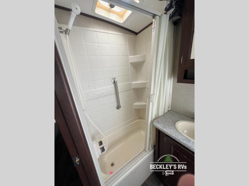 Make all your meals and snacks while traveling easy in this Premier kitchen. There is a second pantry for storage, a refrigerator, three burner range, and large kitchen sink for easy cleanup. Plus there is an overhead cabinet for dishes and things.