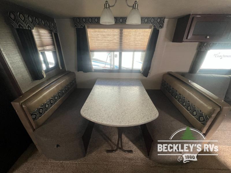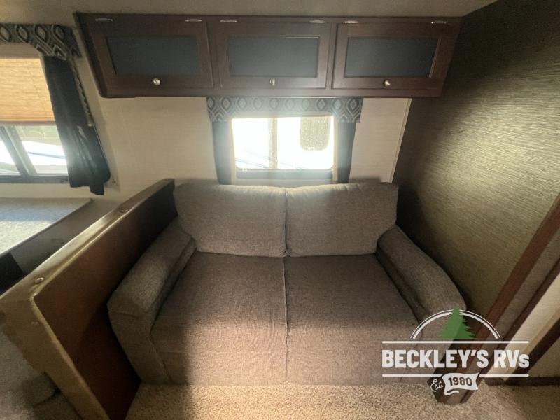 The combined kitchen and living room space feature a large slide out tri-fold sofa and booth dinette. There is a pantry and wardrobe found off to the side of the dinette for storage, and the rest of the kitchen amenities are on the opposite side.
