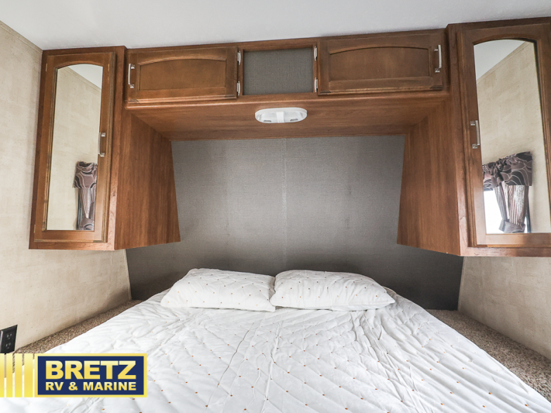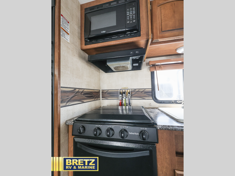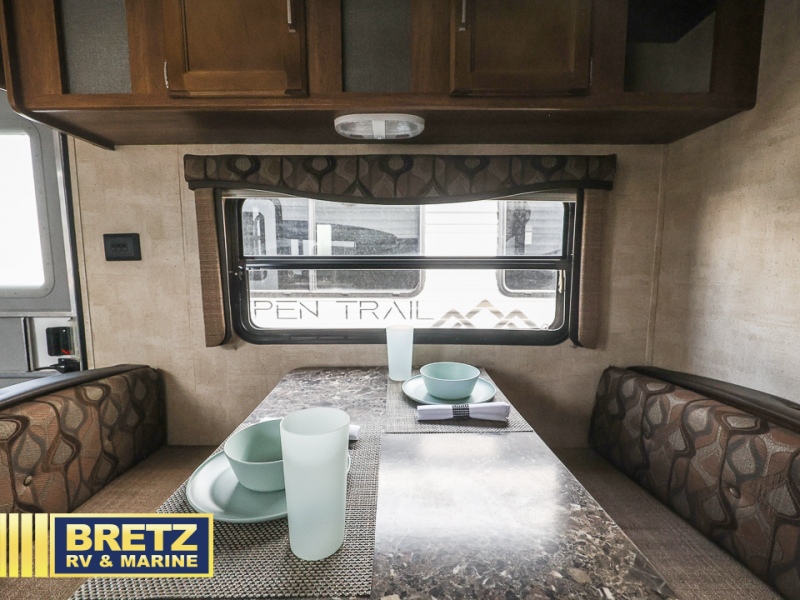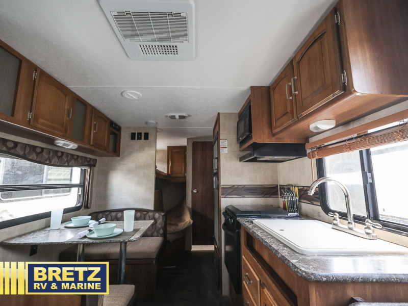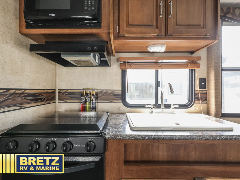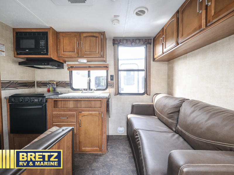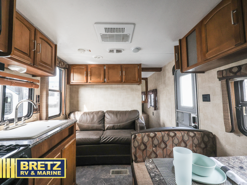 There is a booth dinette to the left of the main entry for dining. There is also storage above for your things. Opposite find a large kitchen sink for cleaning up easily, a three burner range, refrigerator, and overhead cabinets for your dry good storage and dishes.