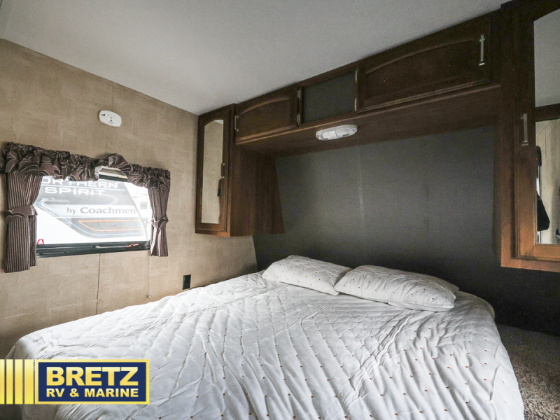 As you enter notice a sofa straight ahead with a small overhead cabinet above. To the right of the entry door find a queen bed with dual bedside closets, and a curtain that can be pulled shut to create a little more private space at night.