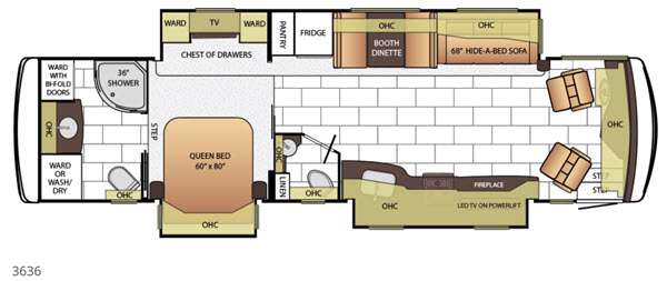 The Ventana 3636 motor home by Newmar features a full wall slide and a bath and a half.