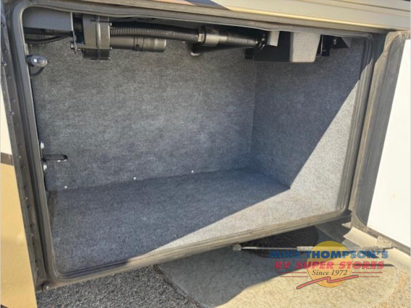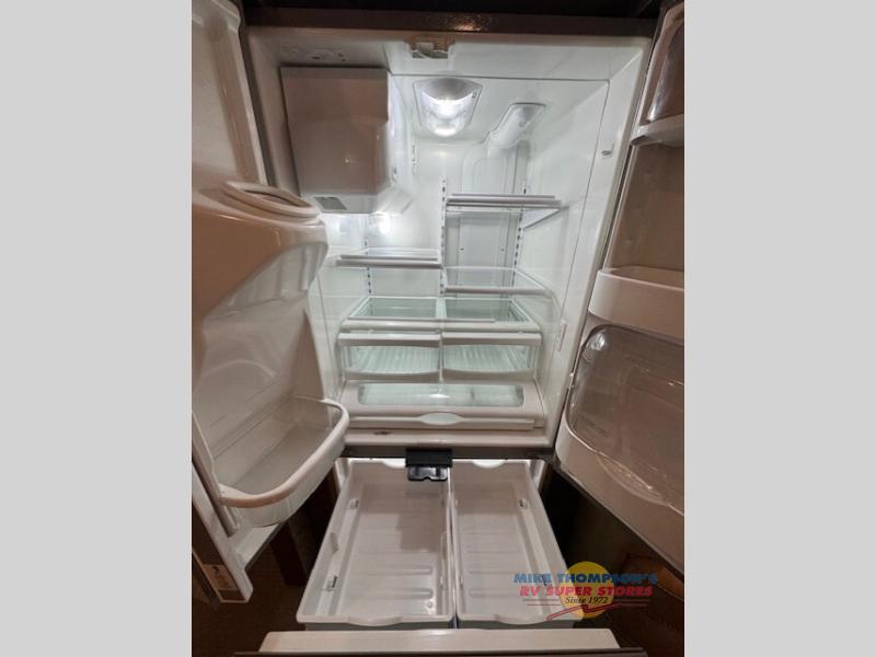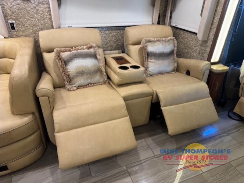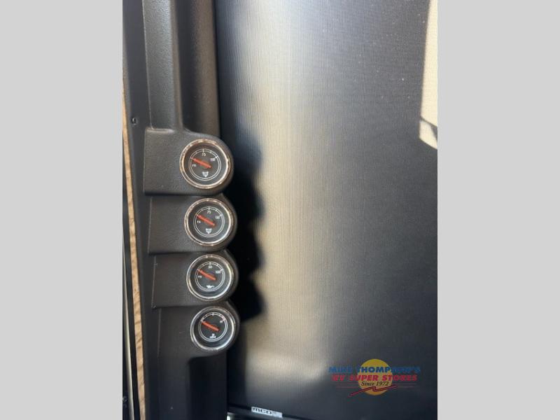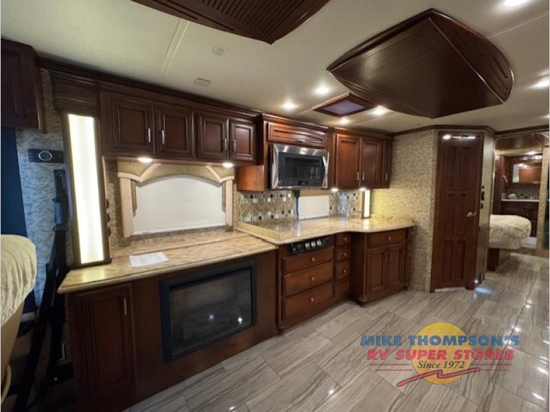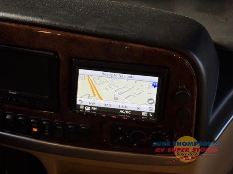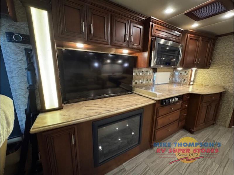 Both the driver and passenger seat easily swivel around to provide more seating in the living area. On the curb side of the motor home you will find a fireplace, LED TV on powerlift, three burner range, and large sink.