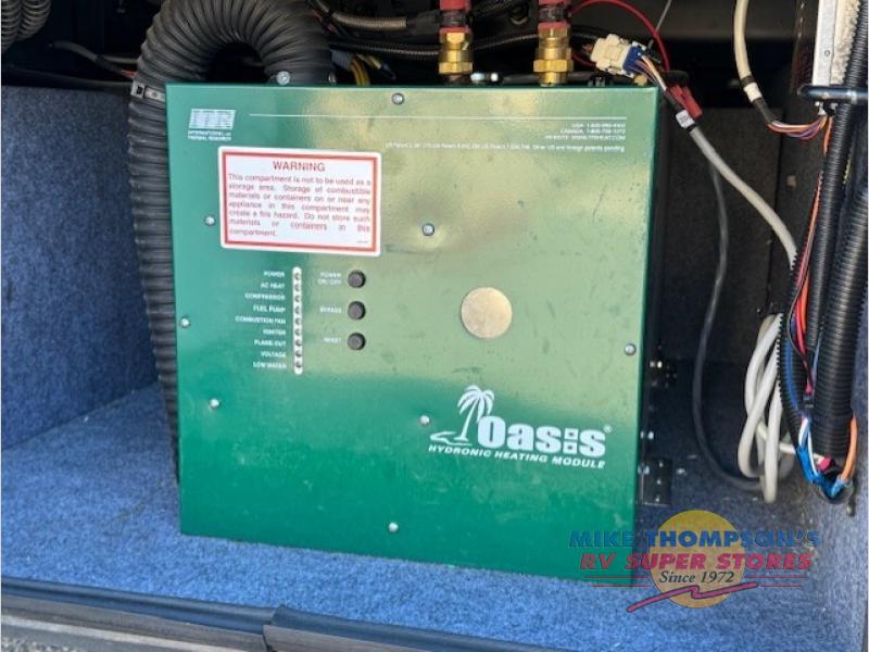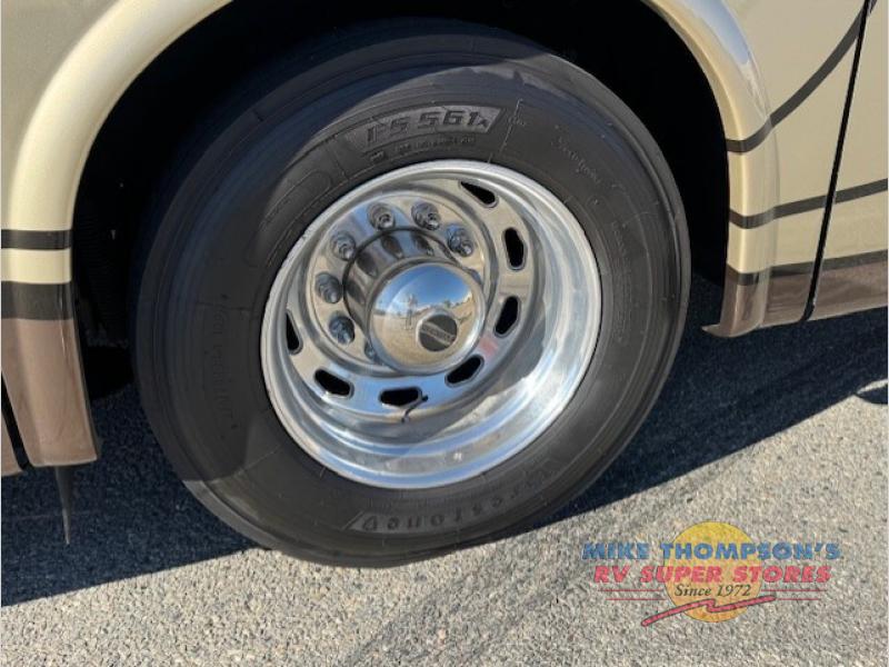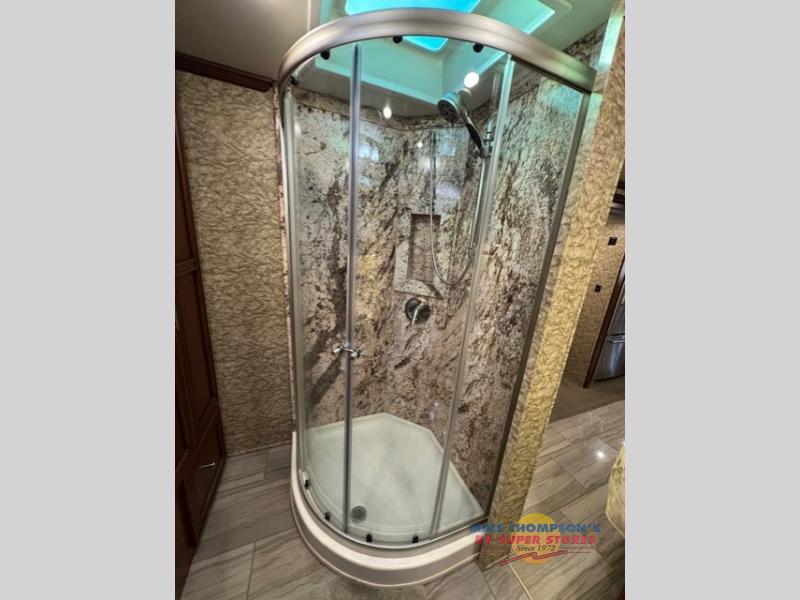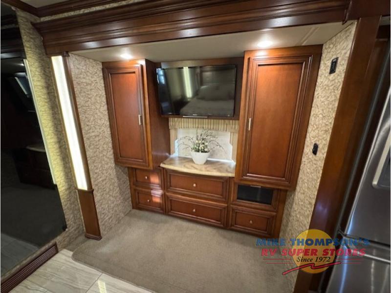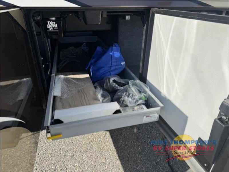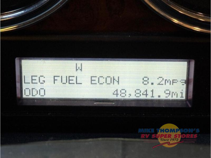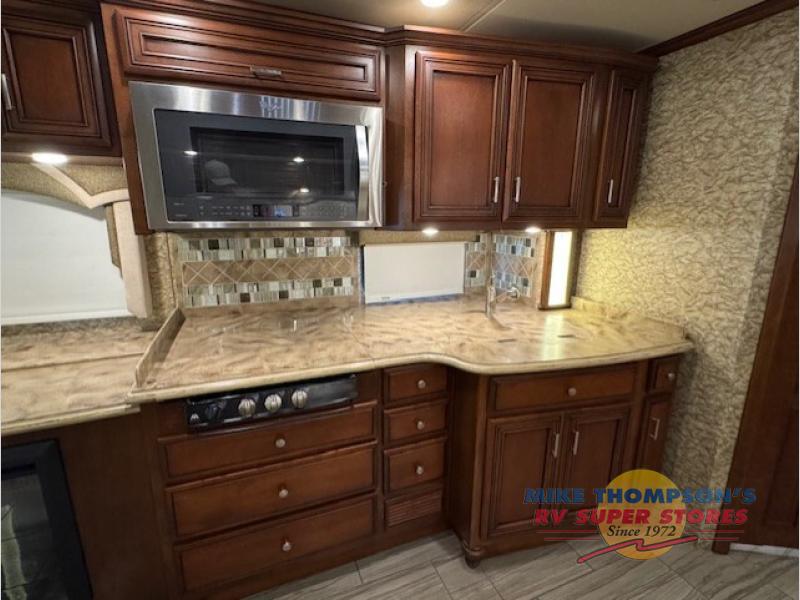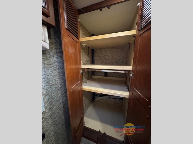 Both the driver and passenger seat easily swivel around to provide more seating in the living area. On the curb side of the motor home you will find a fireplace, LED TV on powerlift, three burner range, and large sink.
