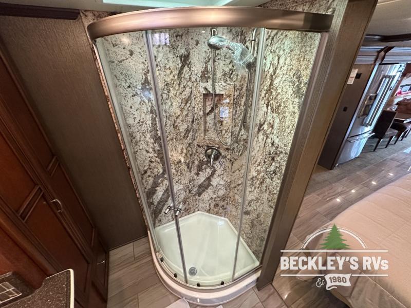The half bath is down the hall. The rear bedroom has a king bed slide. The master bath offers a toilet, sink, wardrobe, and corner shower. There is a full wall slide with two wardrobes, a chest of drawers, overhead TV, pantry, refrigerator, booth dinette, and hide-a-bed sofa.