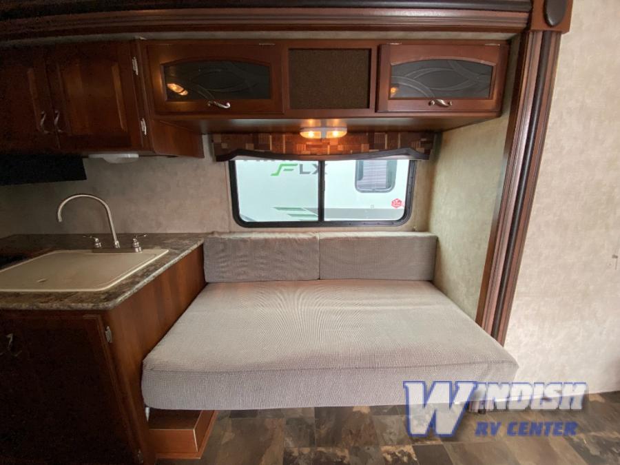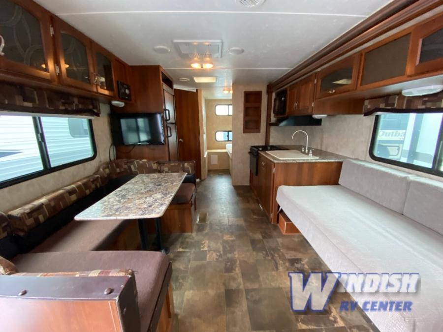 The slide offers a sofa, double kitchen sink, and two burner range. Across from the sofa is a u-shaped dinette, as well as, a refrigerator and wardrobe.