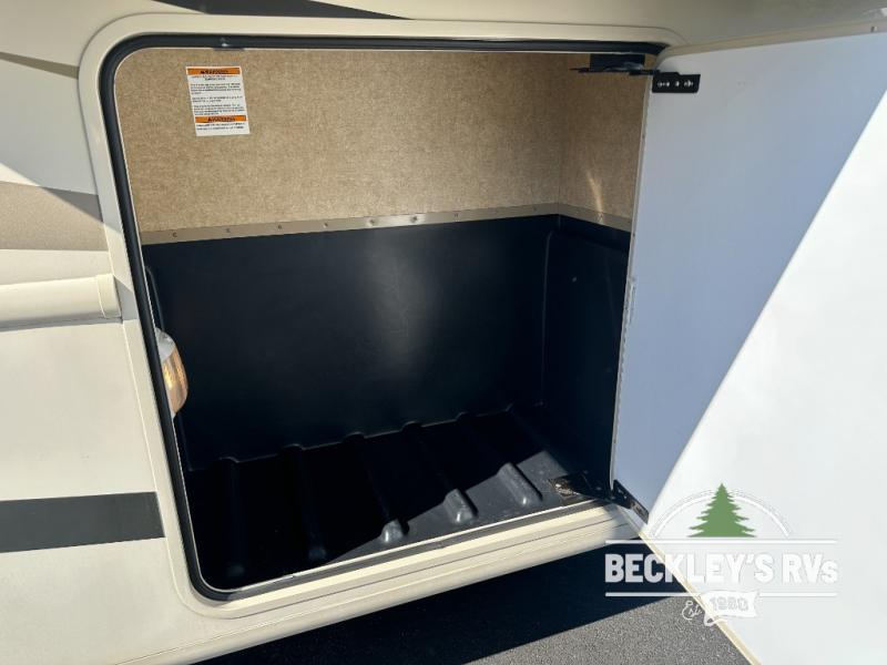 In the living/kitchen area, a generous slide out houses a sofa with air bed, u-shaped dinette and overhead cabinets. A 32" LED TV is mounted on the angled outside wall of the half bath for convenient viewing from the slide out.