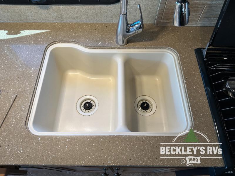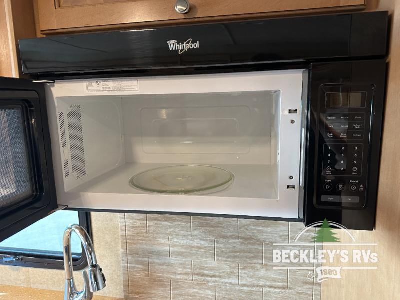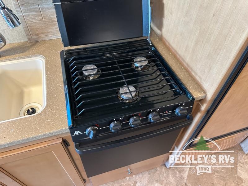 The kitchen along the curb side includes a refrigerator, three burner range, overhead microwave, kitchen sink, counter space and overhead cabinets that extend over the entry door.