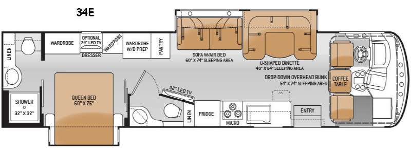 Thor Motor Coach offers the Windsport 34E class A featuring two slides, a bath and a half and a u-shaped dinette.
