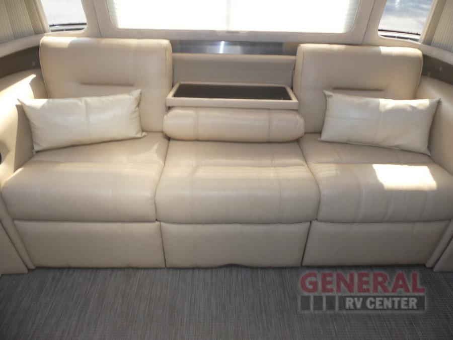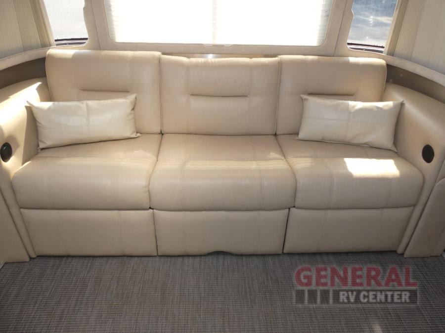 As you enter the travel trailer, along the front wall of the trailer there is a sofa with power recliners.
