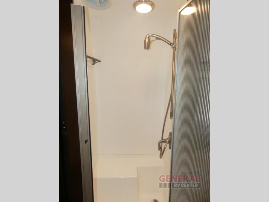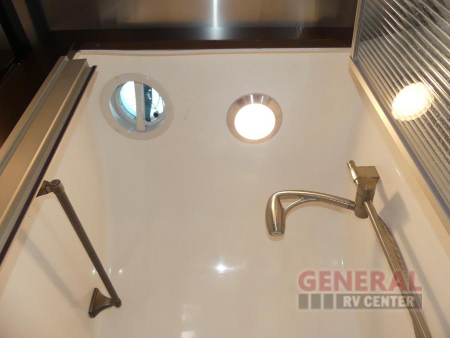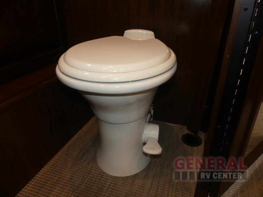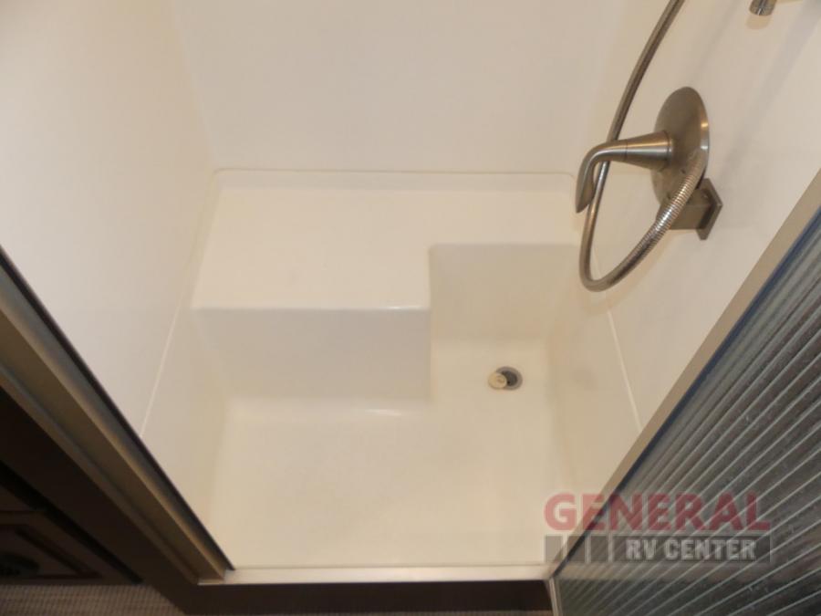 The bathroom has a private toilet area and sink on one side of the trailer. Across from the toilet area there is a shower and large wardrobe.