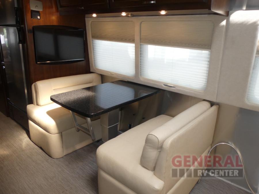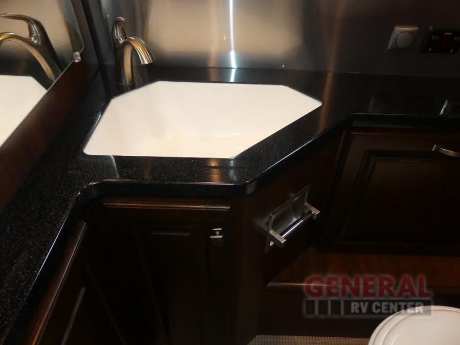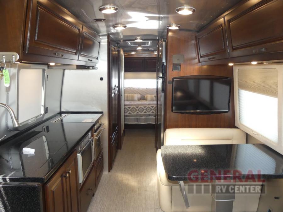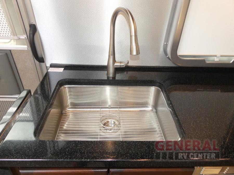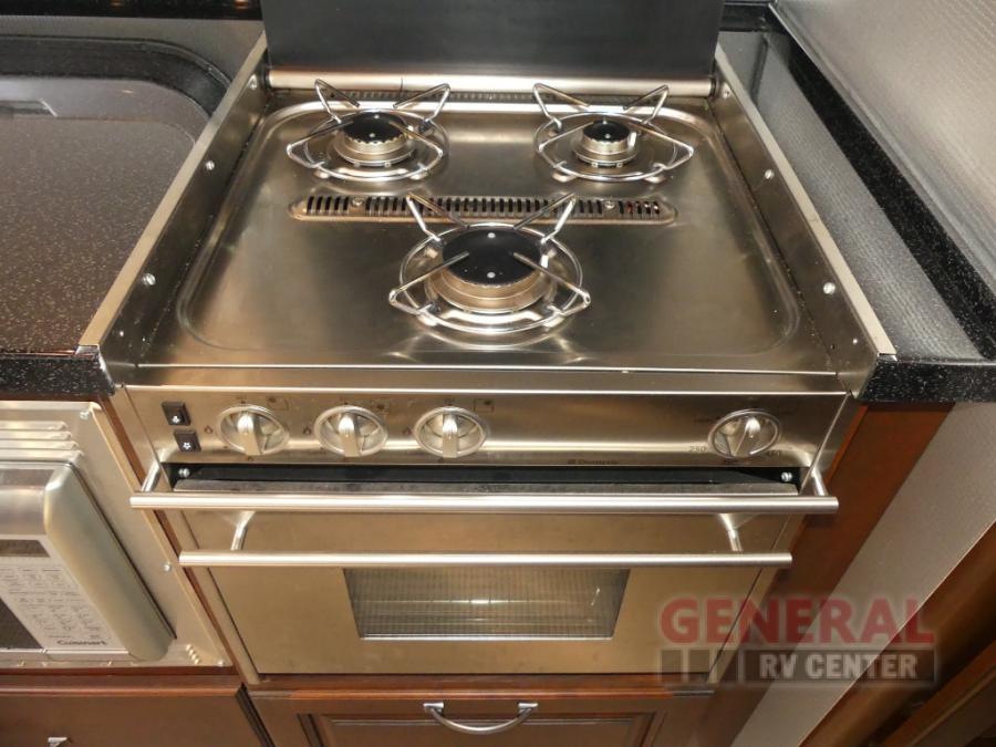 The galley has a double kitchen sink, three burner range. On the opposite side of the trailer you will find a dinette, LED TV above the dinette, refrigerator and slide out pantry.