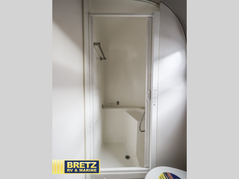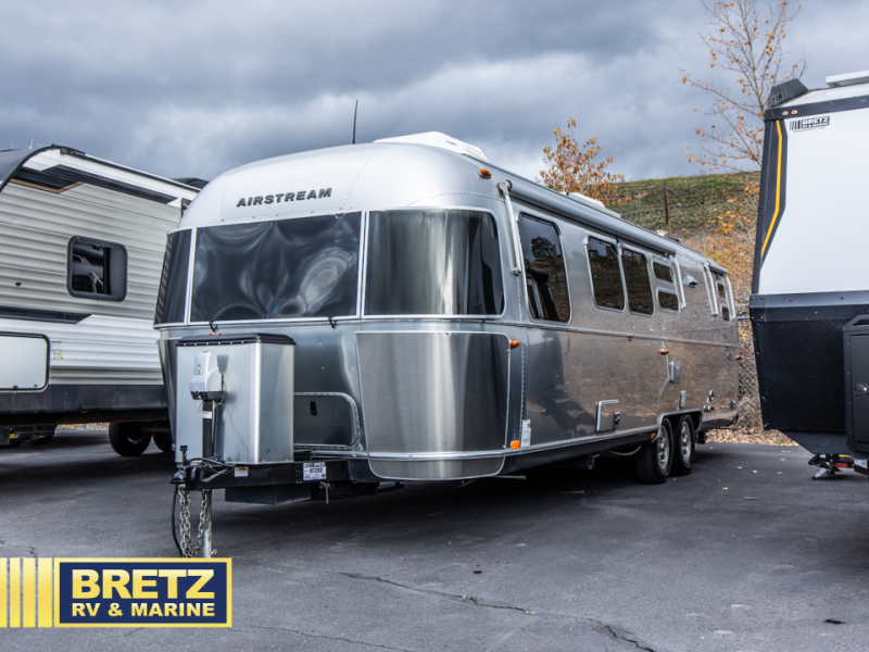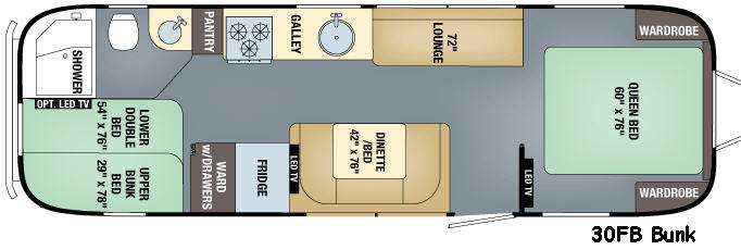 The Flying Cloud 30FB Bunk travel trailer by Airstream offers a rear bath layout, plus front and rear sleeping space with a queen bedroom up front and a rear double bed with single bunk above. This unit sleeps up to 8 people.