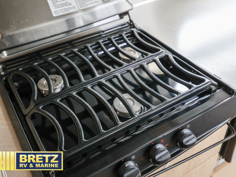 The kitchen features a round sink, and three burner range plus pantry along the road side wall. The opposite side offers a refrigerator for your perishables.