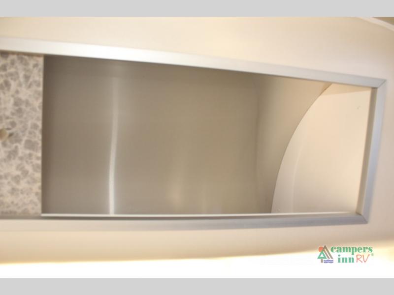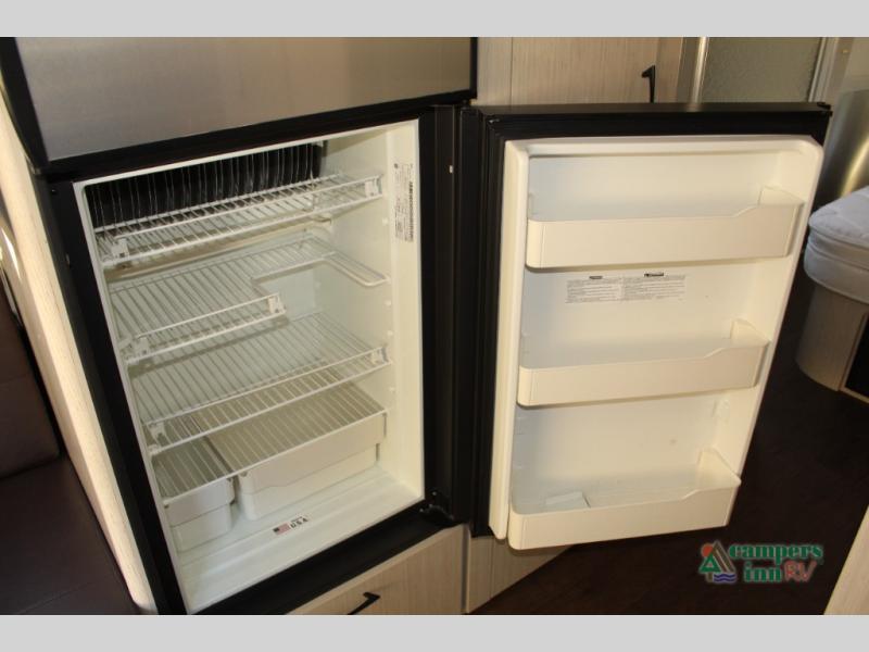 The galley has a sink, three burner range, and pantry on one side of the travel trailer. On the opposite side you will find a refrigerator.