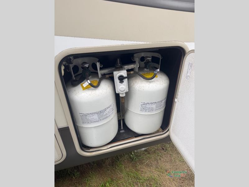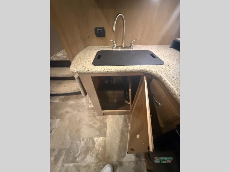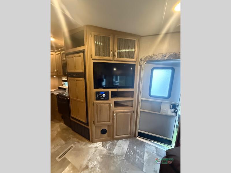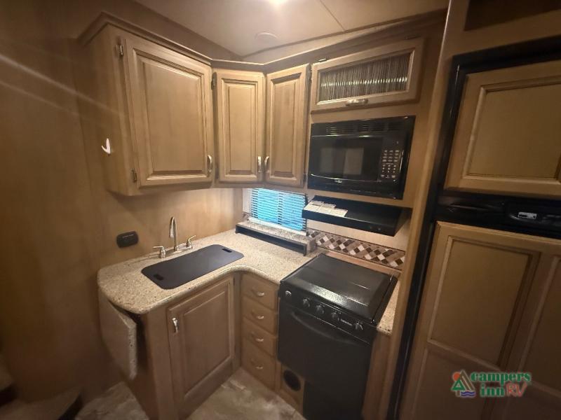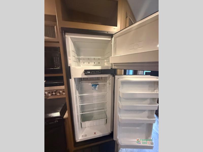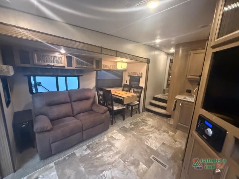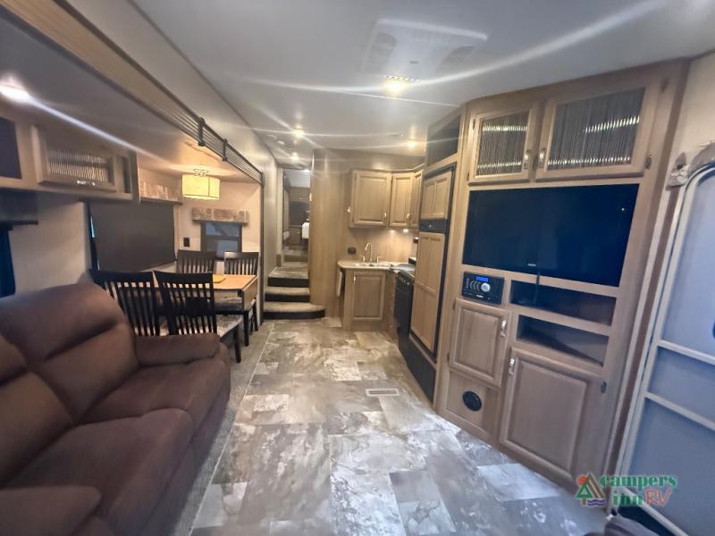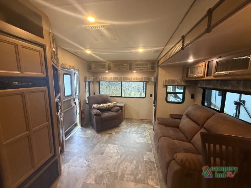 As you enter the fifth wheel, along the rear wall you will find two lounge chairs. The slide offers a sofa and a dinette. On the opposite side of the fifth wheel there is a corner entertainment center, refrigerator, three burner range, double kitchen sink, and flip-up counter.