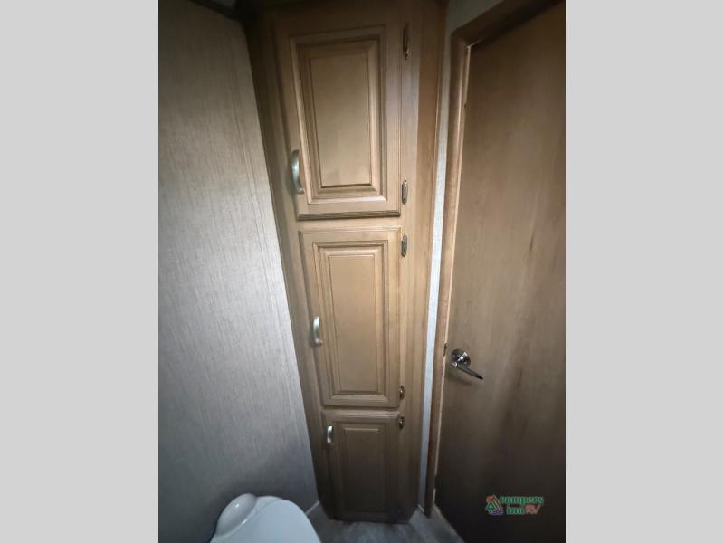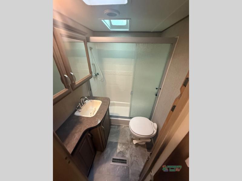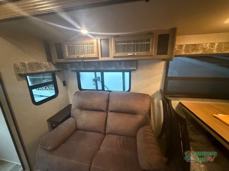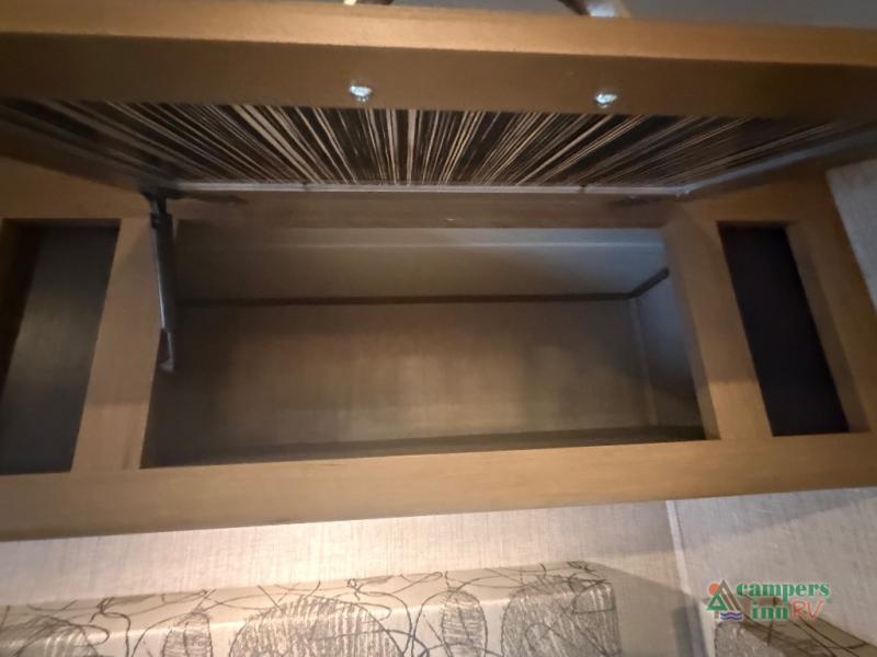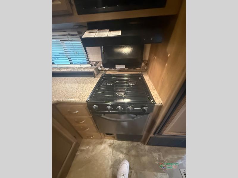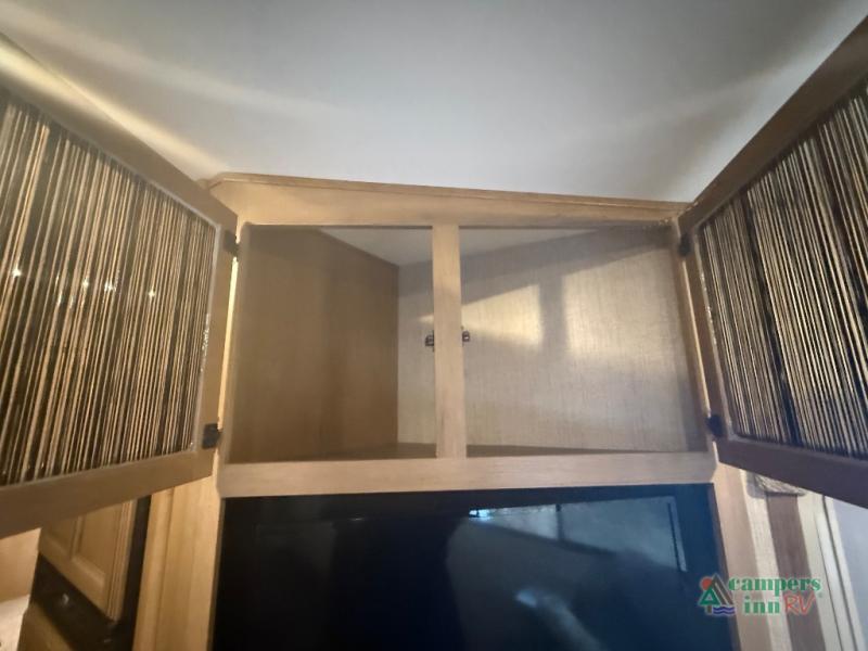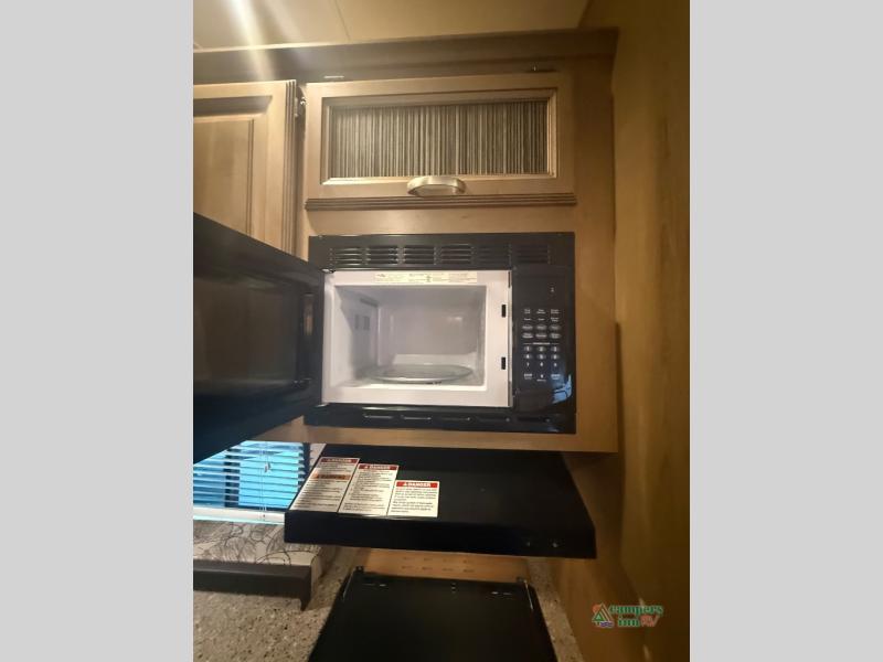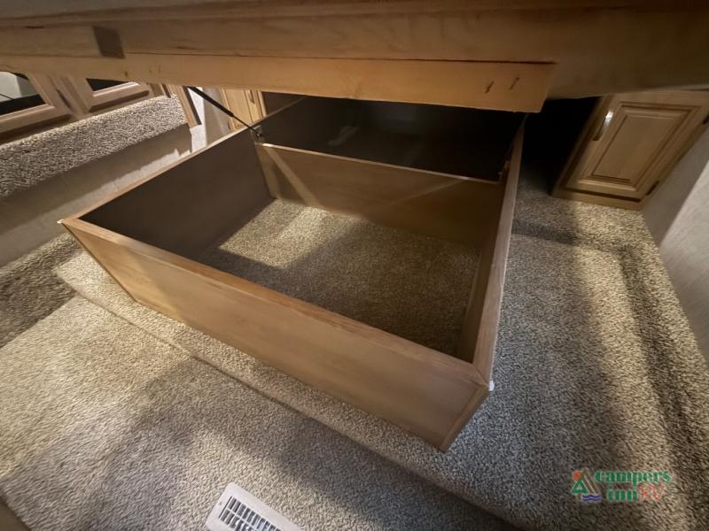 As you enter the fifth wheel, along the rear wall you will find two lounge chairs. The slide offers a sofa and a dinette. On the opposite side of the fifth wheel there is a corner entertainment center, refrigerator, three burner range, double kitchen sink, and flip-up counter.