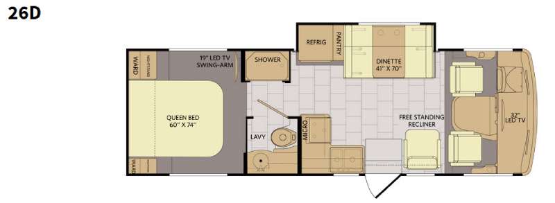 As you enter the Flair 26D class A gas motor home by Fleetwood RV you will find to the right a free-standing recliner. Above the front cab there is a 32" LED TV for your enjoyment.