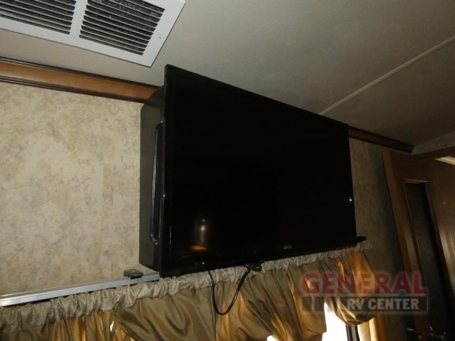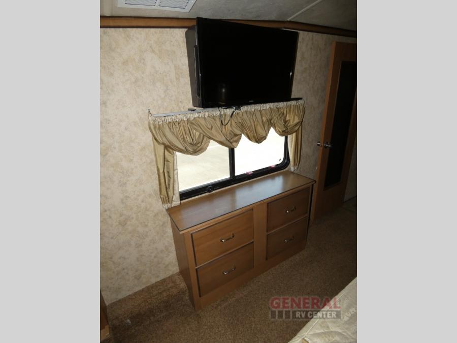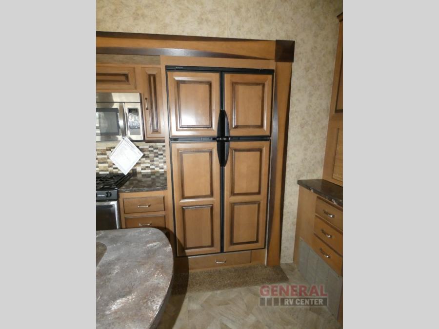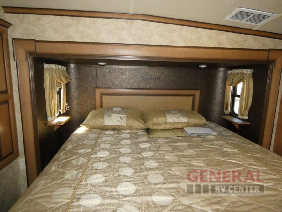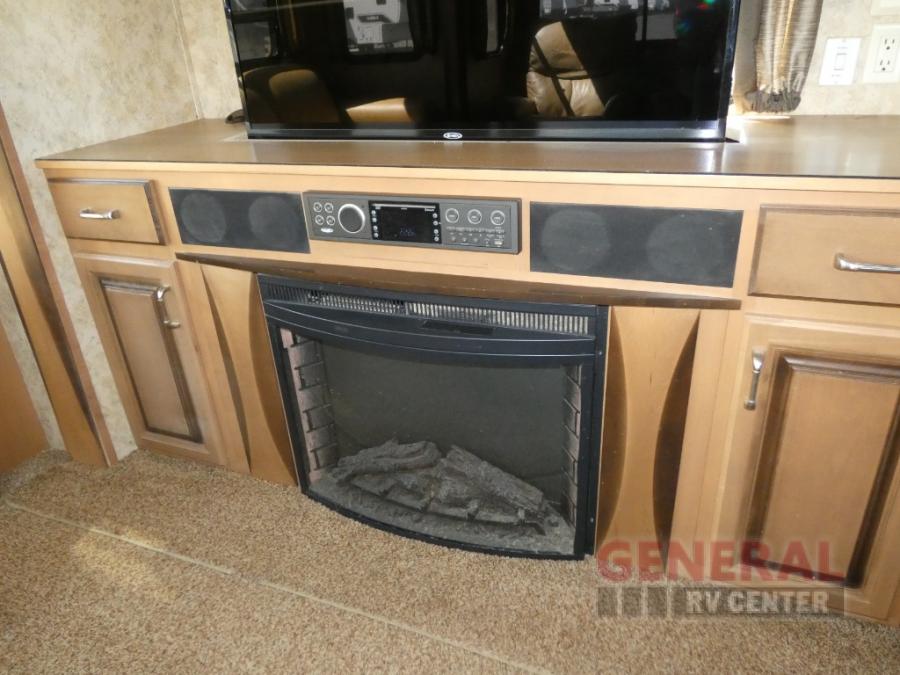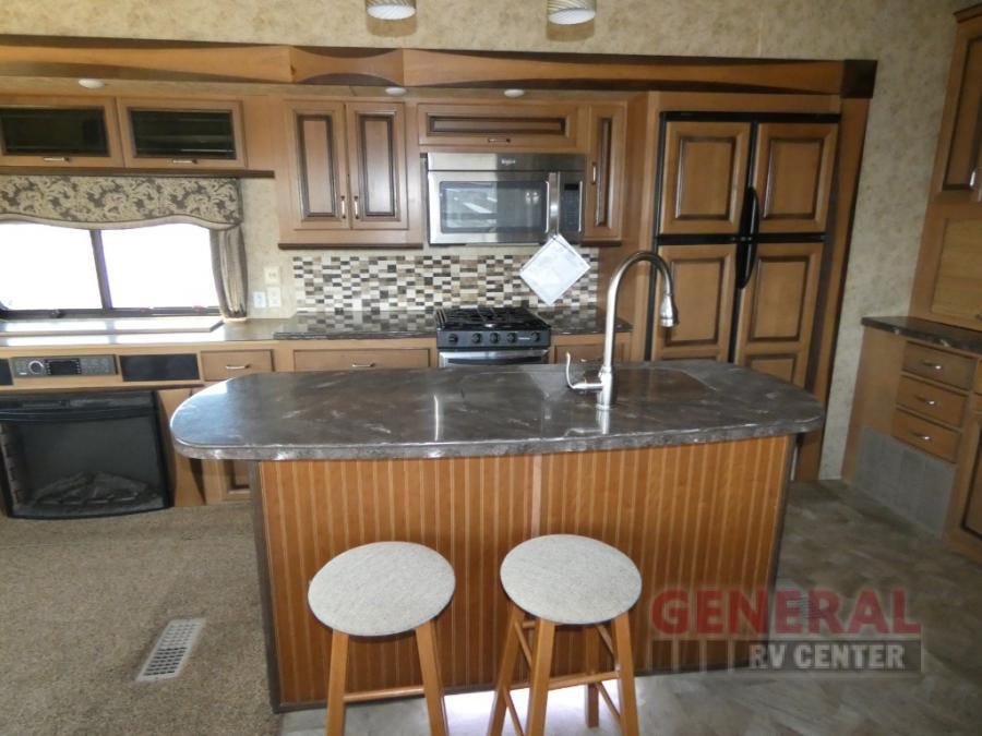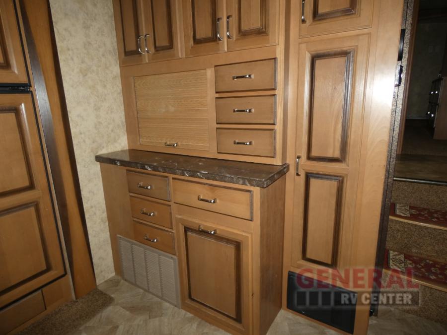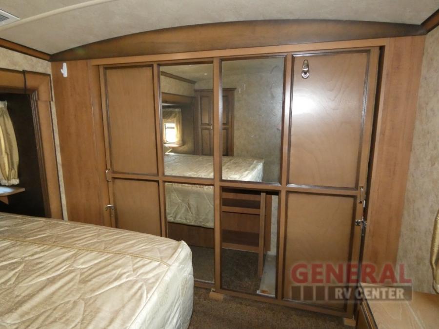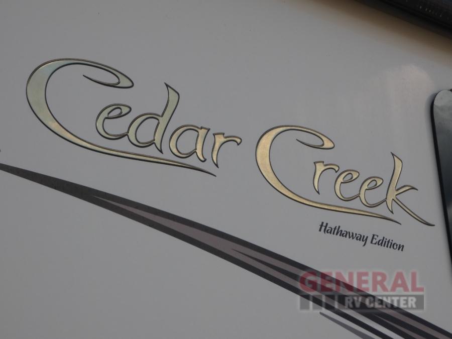Two generous slide outs are located in the main living/kitchen area. As you enter this Cedar Creek, to the left is a slide out which has a free standing dinette with chairs, and two lounge chairs. A sofa with end table at each end and overhead cabinets runs the width of the back wall. Continuing around, another slide features a fireplace with TV lift, three burner range top, overhead microwave, pantry, refrigerator, and overhead cabinet storage. The kitchen is rounded out with a beautiful Hoosier style kitchen cabinet with extra counter space, a closet and an island with a double kitchen sink.