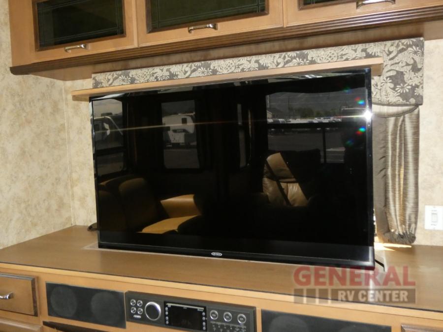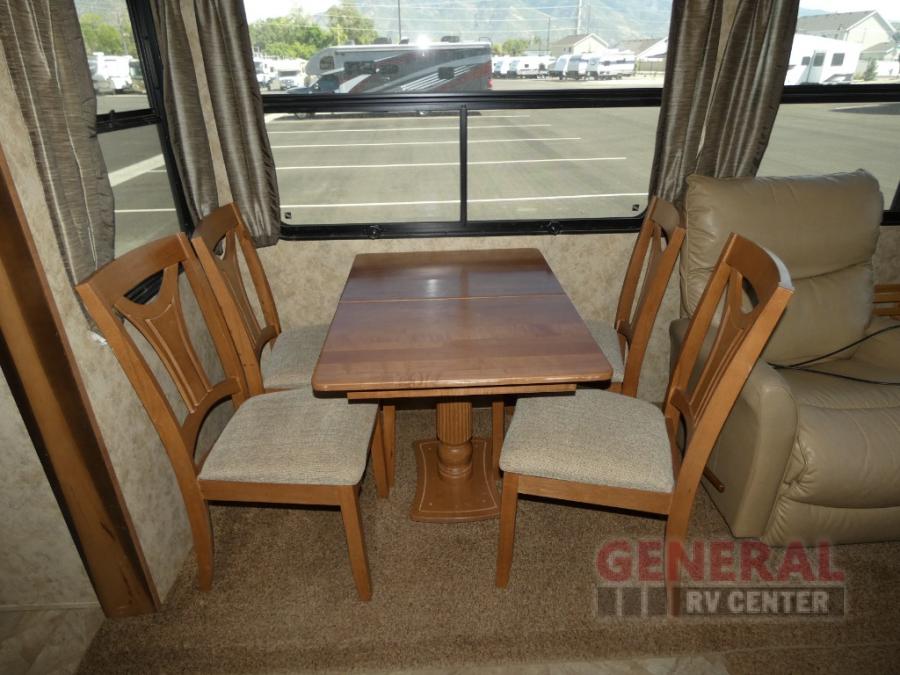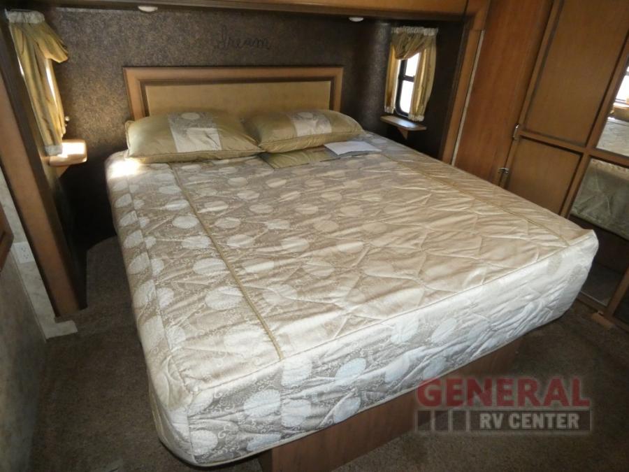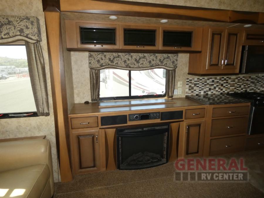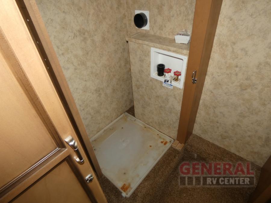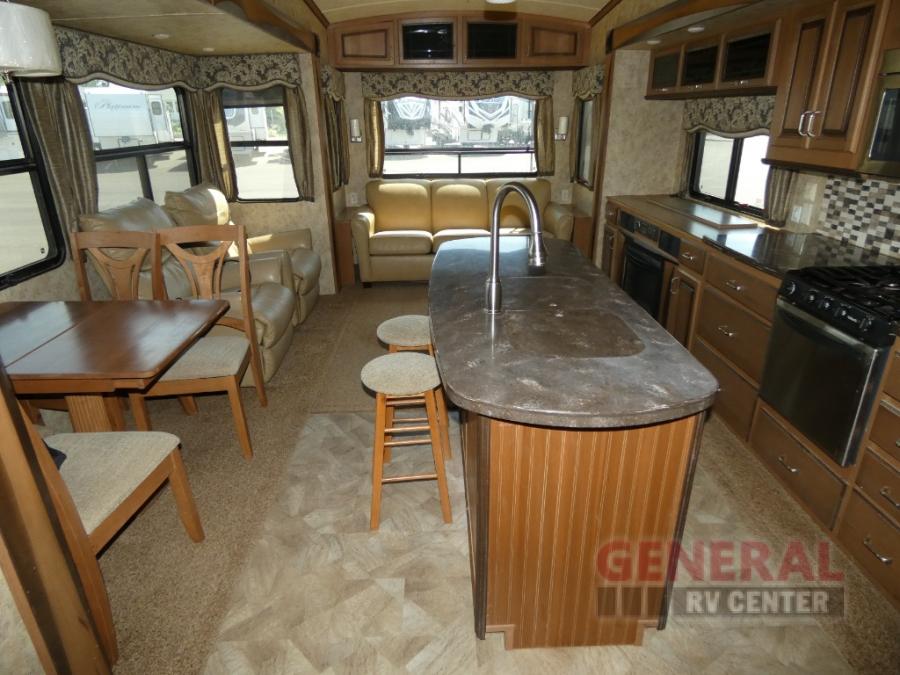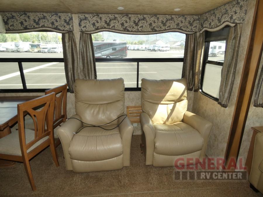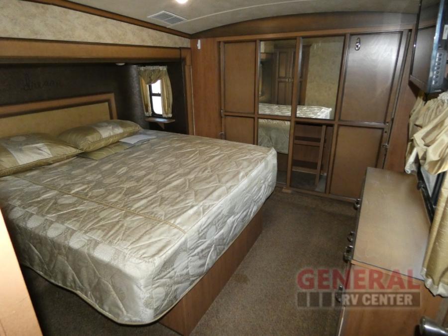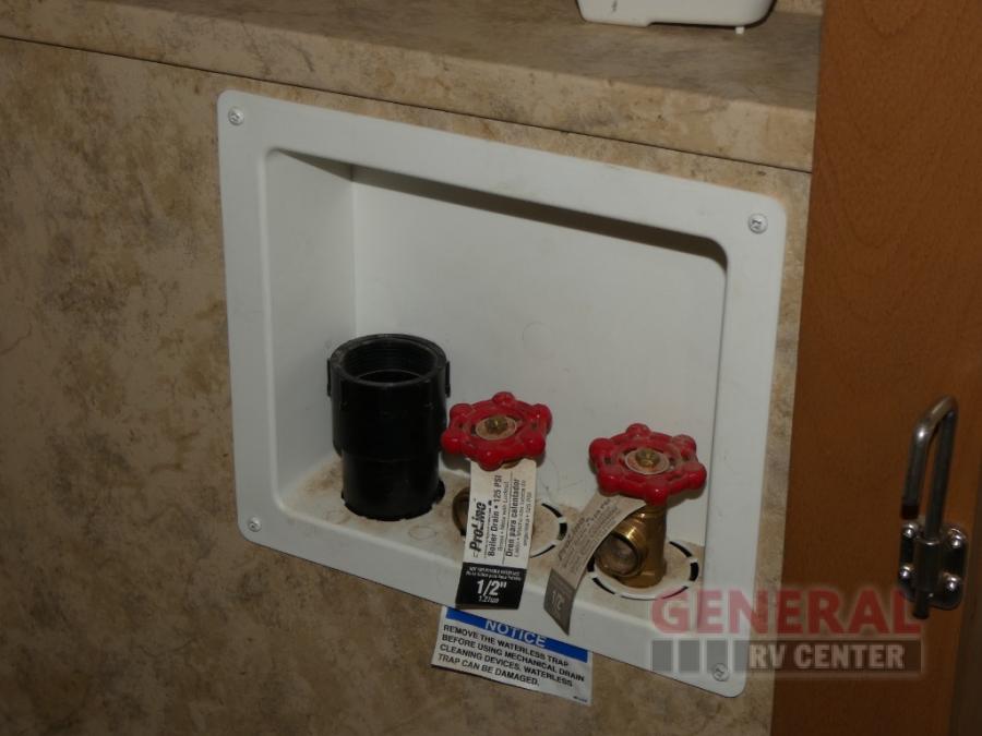 Two generous slide outs are located in the main living/kitchen area. As you enter this Cedar Creek, to the left is a slide out which has a free standing dinette with chairs, and two lounge chairs. A sofa with end table at each end and overhead cabinets runs the width of the back wall. Continuing around, another slide features a fireplace with TV lift, three burner range top, overhead microwave, pantry, refrigerator, and overhead cabinet storage. The kitchen is rounded out with a beautiful Hoosier style kitchen cabinet with extra counter space, a closet and an island with a double kitchen sink.