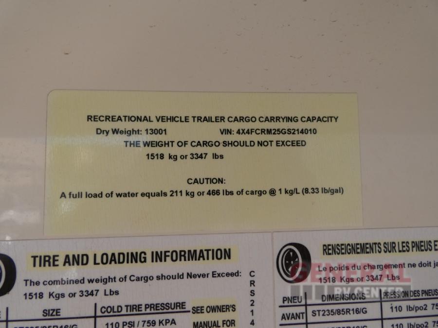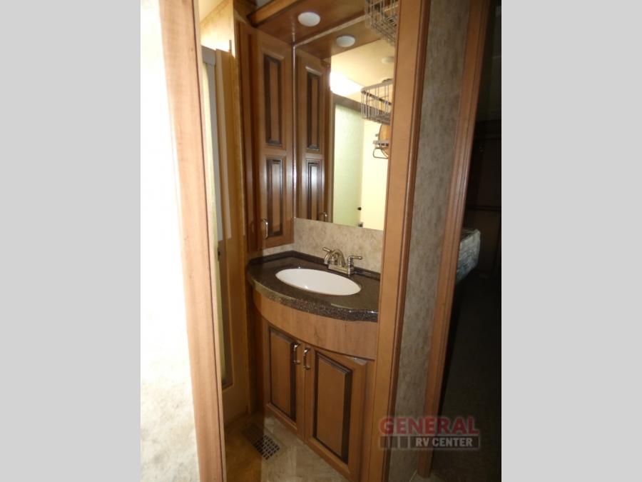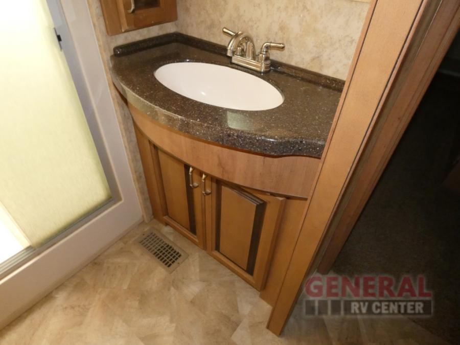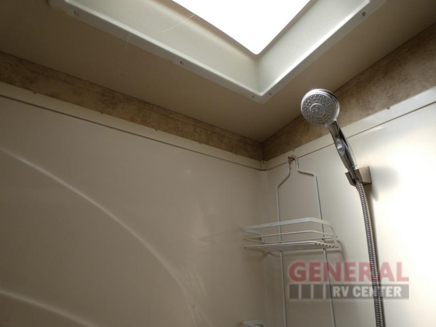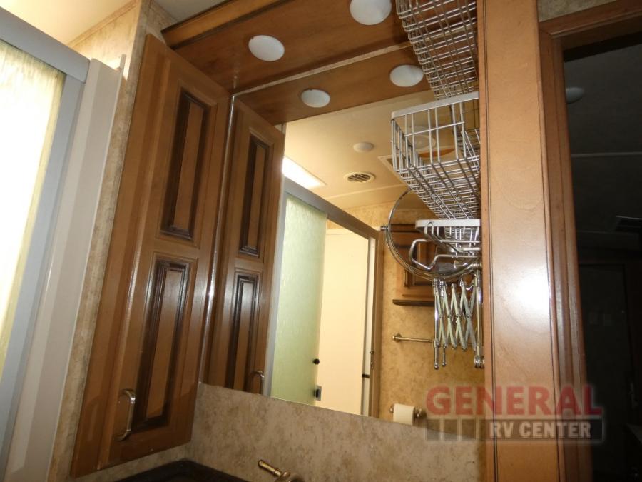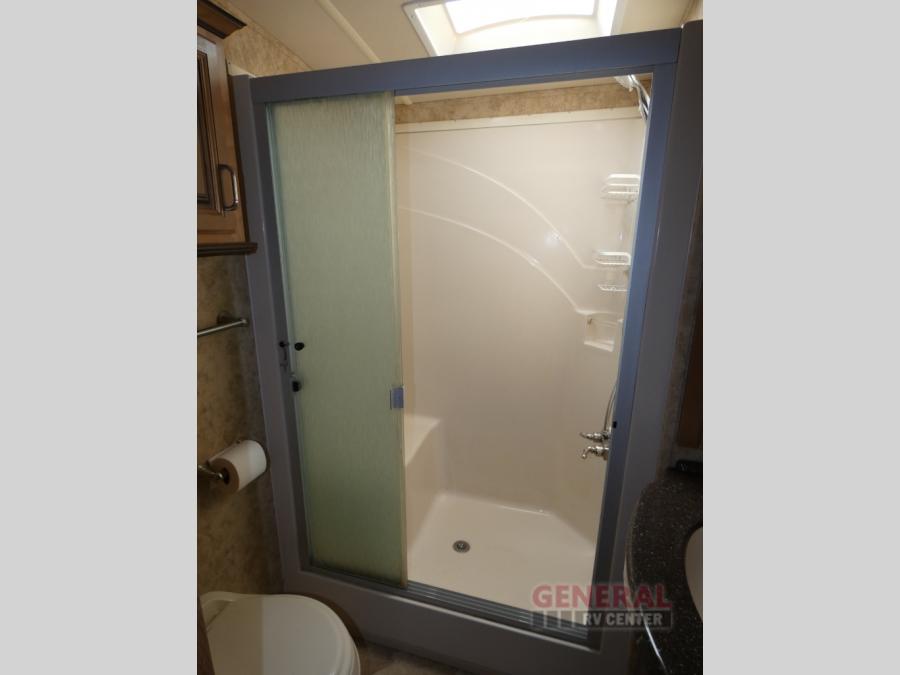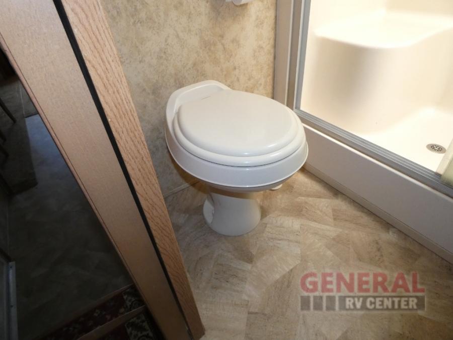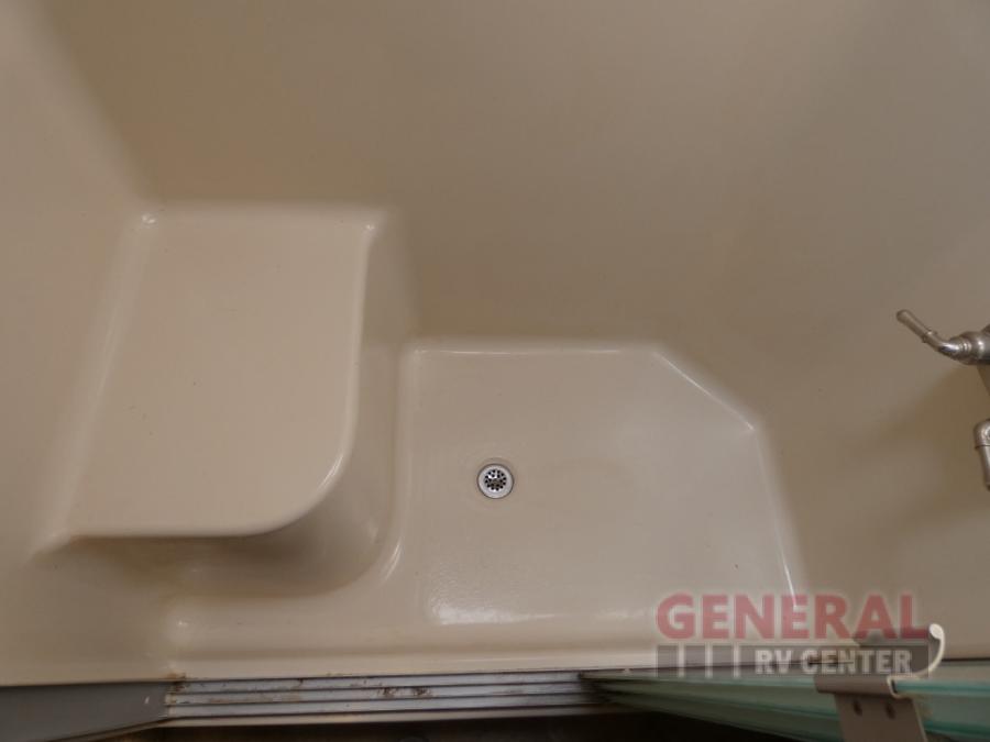 Up the steps towards the front of the fifth wheel the bathroom is on your left. It includes a vanity sink, medicine cabinet, residential size shower with seat, toilet and overhead cabinet.