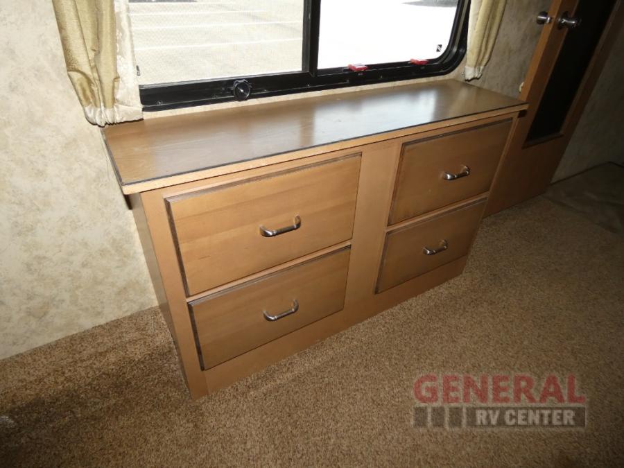 The private front bedroom offers a queen bed slide out with a shelf on either side. There is also a linen area with hamper, dresser and full width wardrobe with shelves and drawers for all of your storage needs and much more.