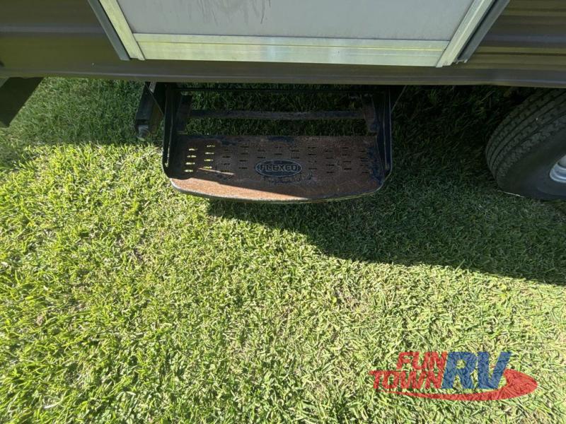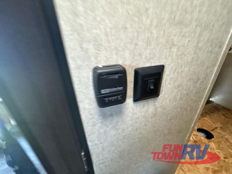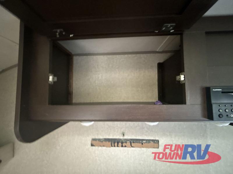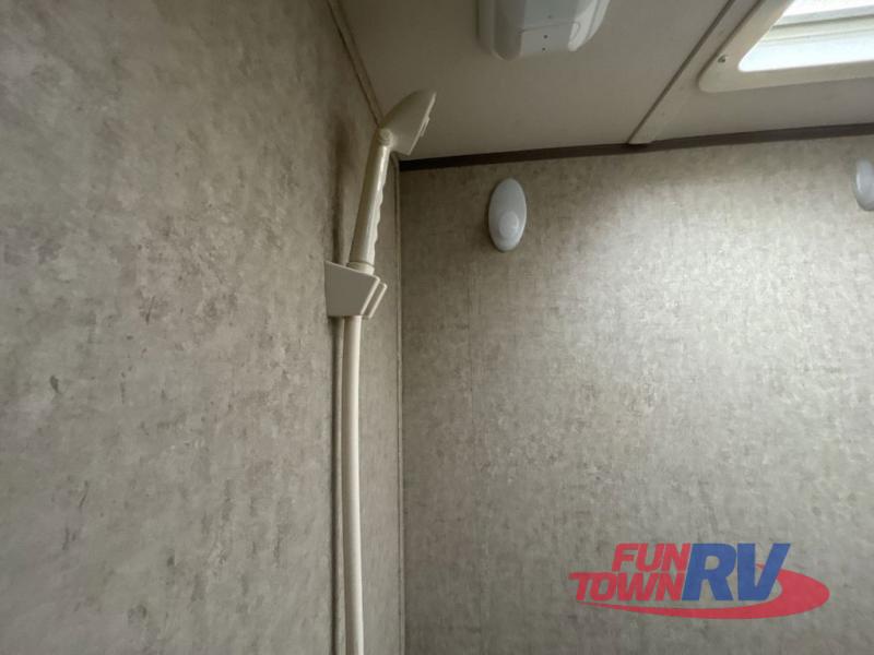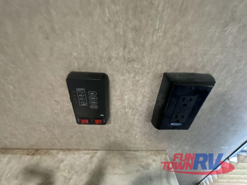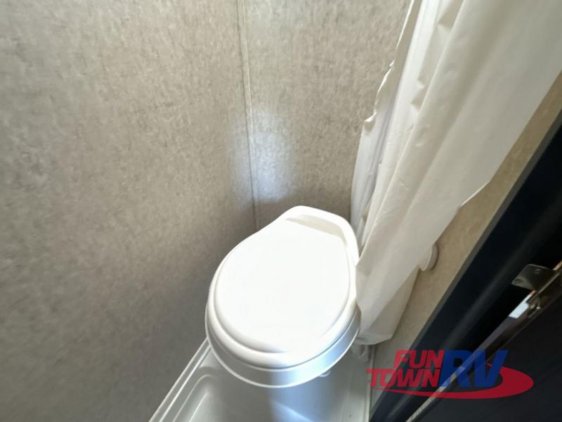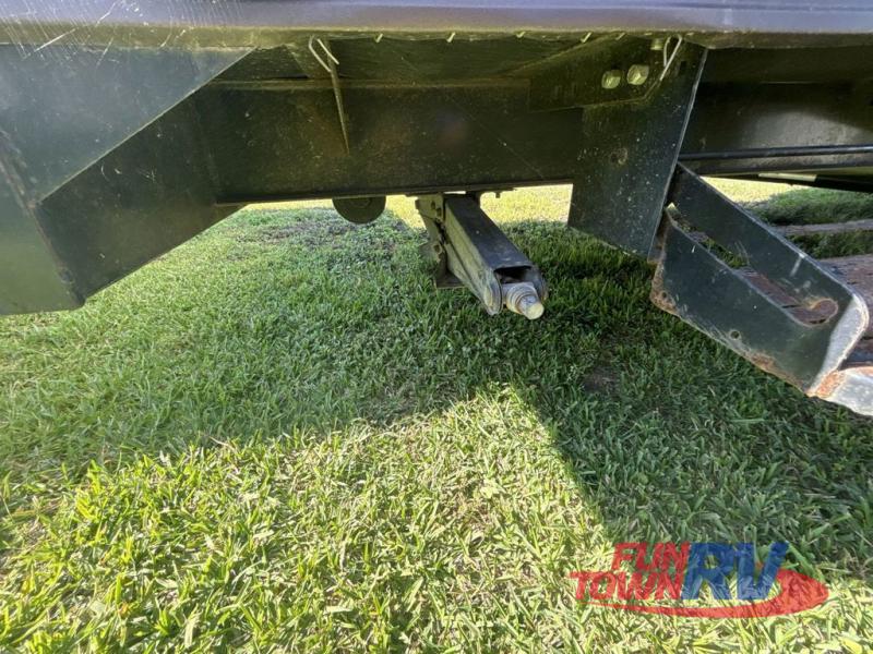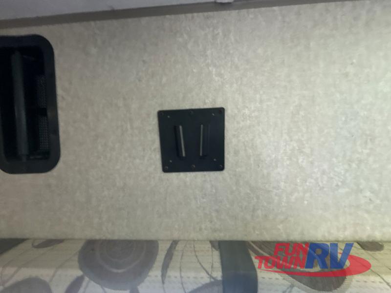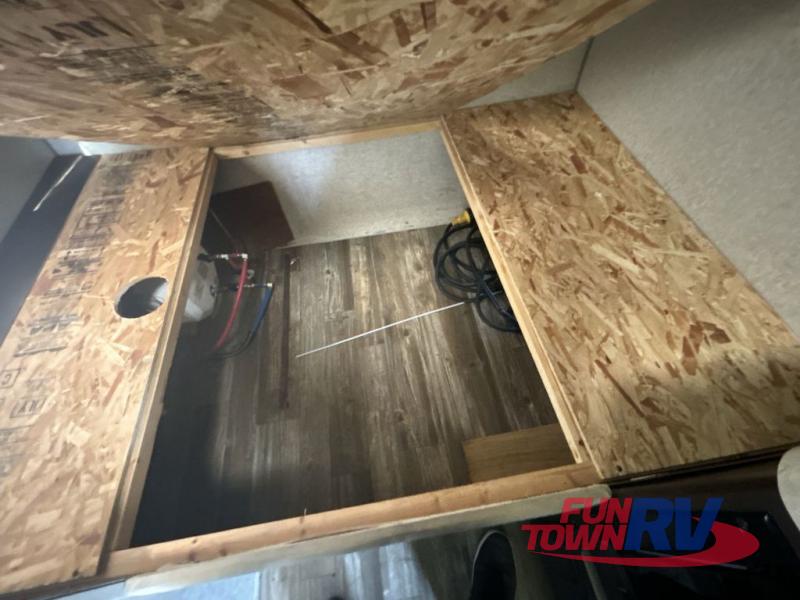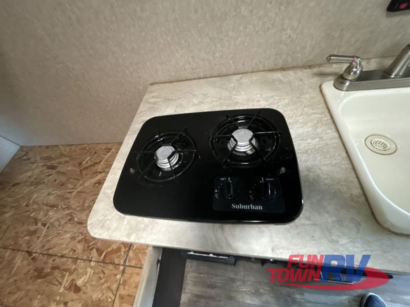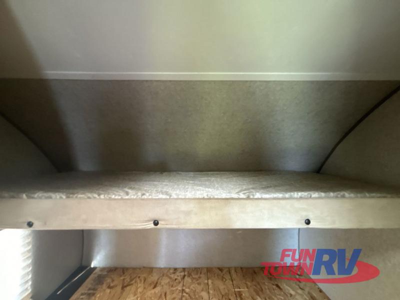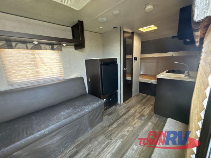 As you step into the toy hauler from the side man door, there is a removable table and rollover sofa immediately in front of you. A refrigerator and wet bath with toilet run along the far side wall. At the front you will find a 28" top bunk with a 50" bunk below. As you continue around, there is a two burner range and single bowl kitchen sink. There is also a spot for an LCD TV mount on this wall. Overhead cabinets are featured above the sofa and in the kitchen area, and much more.