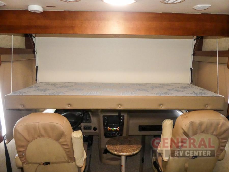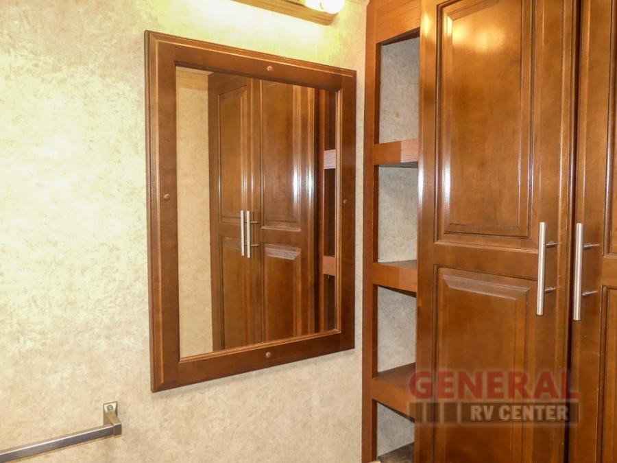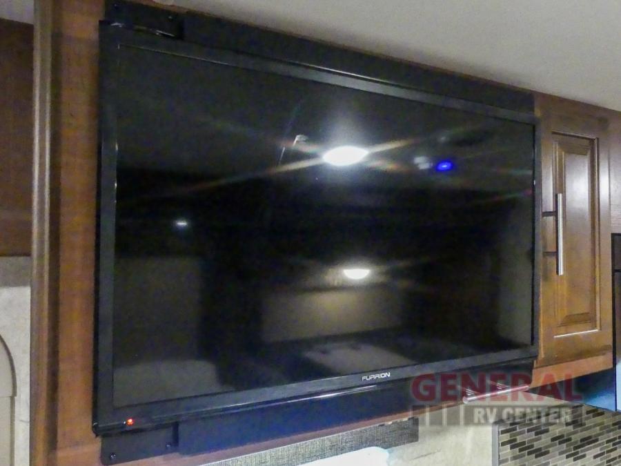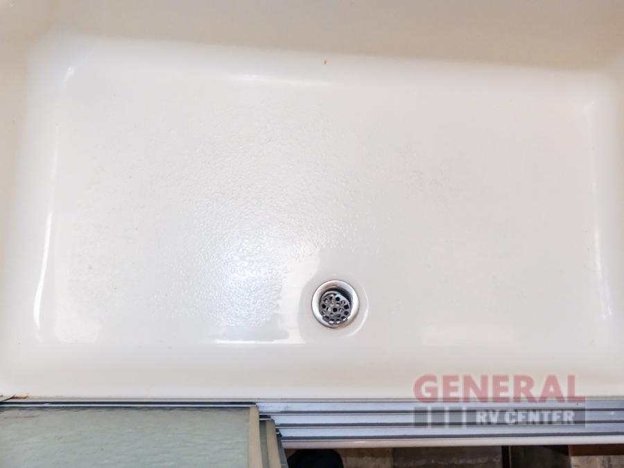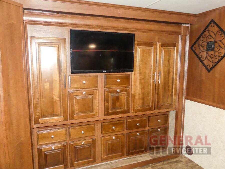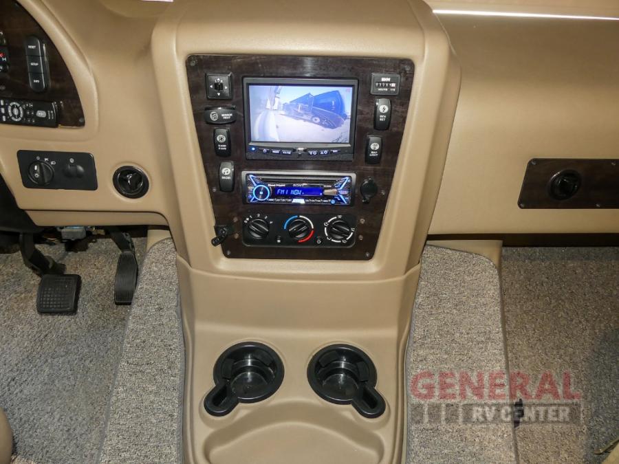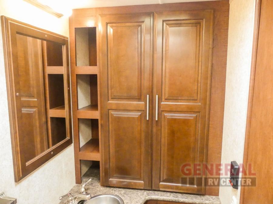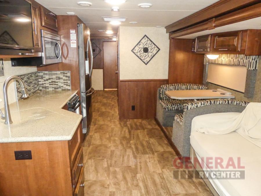 You will be wowed by the space and beauty inside the motor home. In the kitchen/living area there is a slide with a hide-a-bed sofa, dinette, and overhead cabinet. On the opposite side of the motor home you will see a double kitchen sink, overhead TV, three burner range, microwave, refrigerator and pantry.