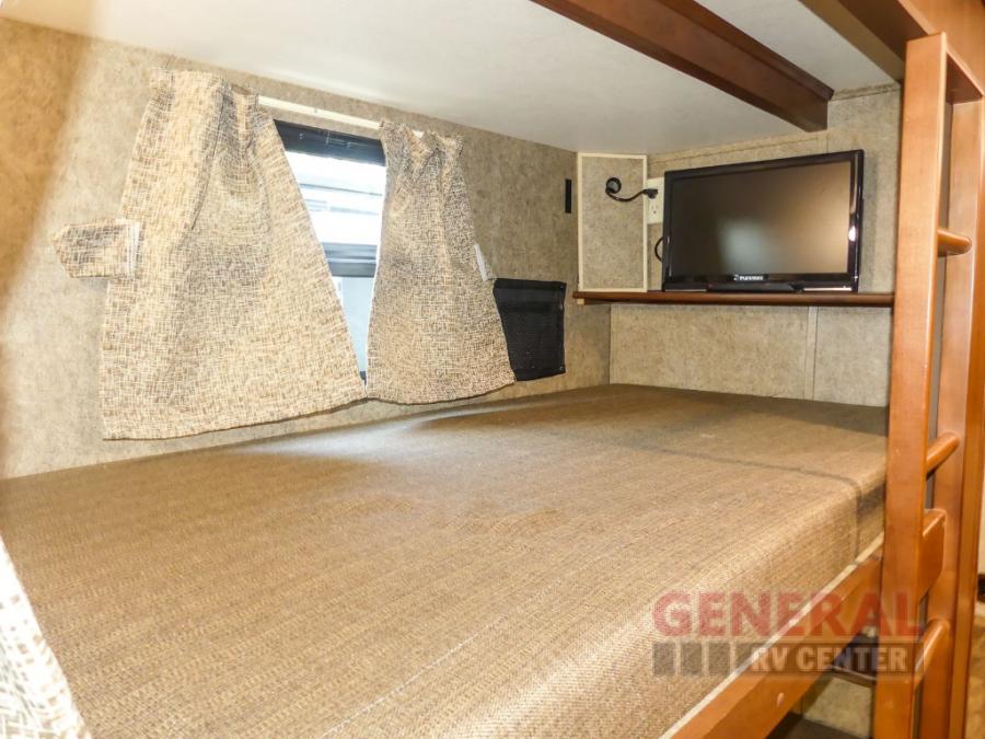 Across from the bathroom and leading in the bedroom there is a slide with a set of bunk beds, large wardrobe, and TV. Across from the wardrobe you will find a slide with a king bed. Along the rear of the room there is a master bath with a shower, toilet, sink, washer/dryer, and more!