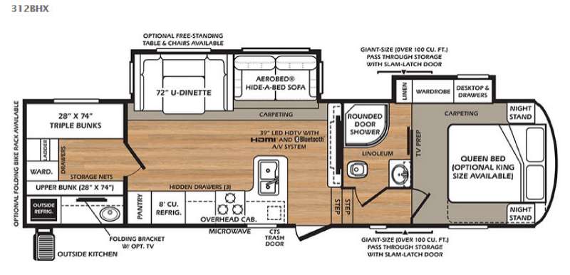 The 312BHX Wildcat fifth wheel by Forest River features a rear bunkhouse for more space for your kids. You will find a set of triple bunks, wardrobe, and an upper bunk.