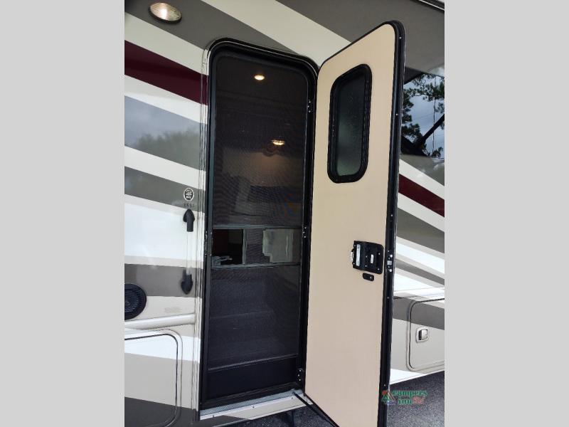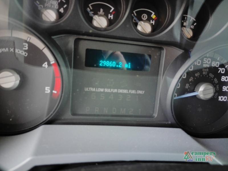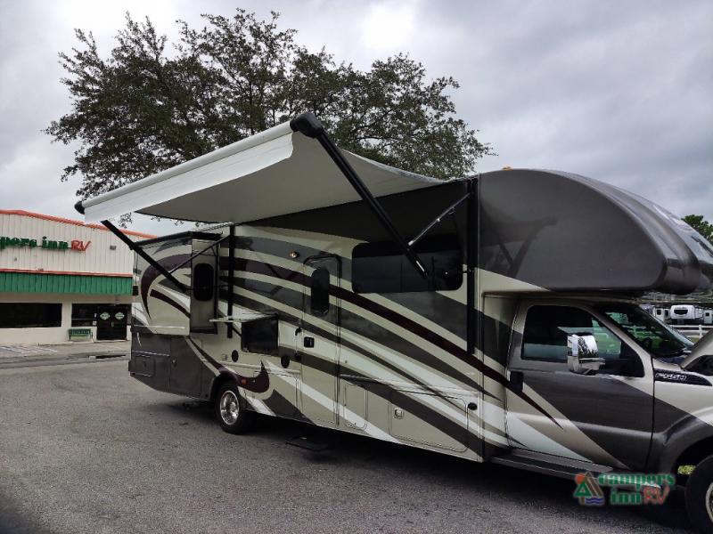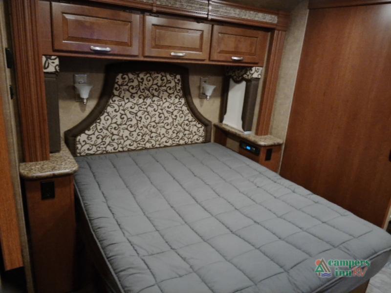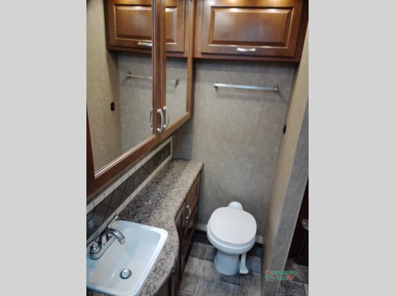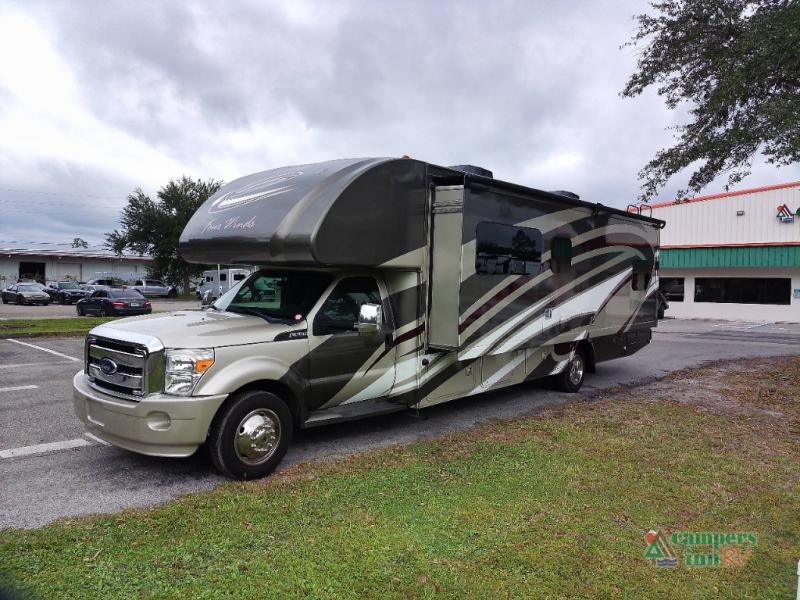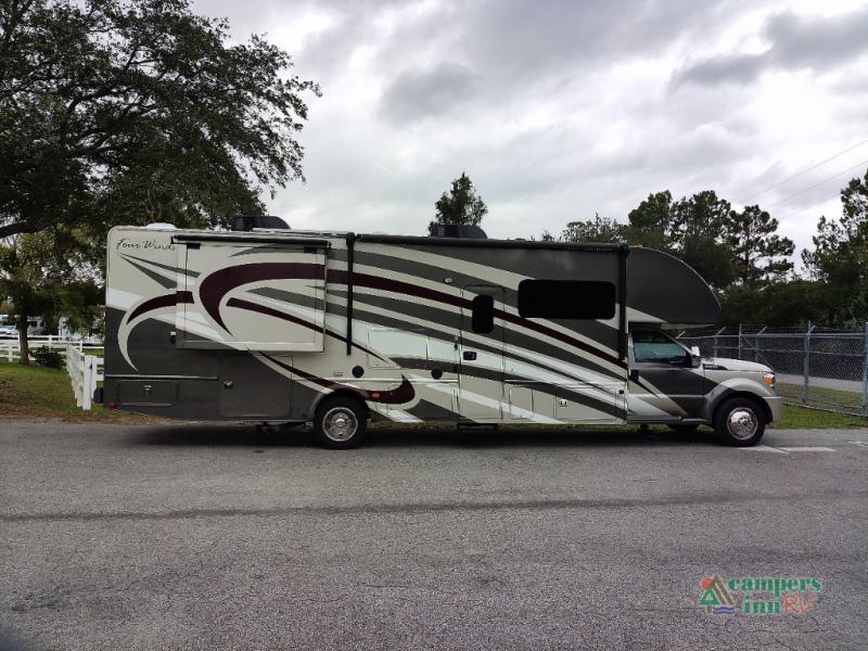 This Four Winds Super C 35SF diesel motorhome features a rear bath and a half bath, a full wall slide along the driver's side, plus additional sleeping area to bring along some friends!