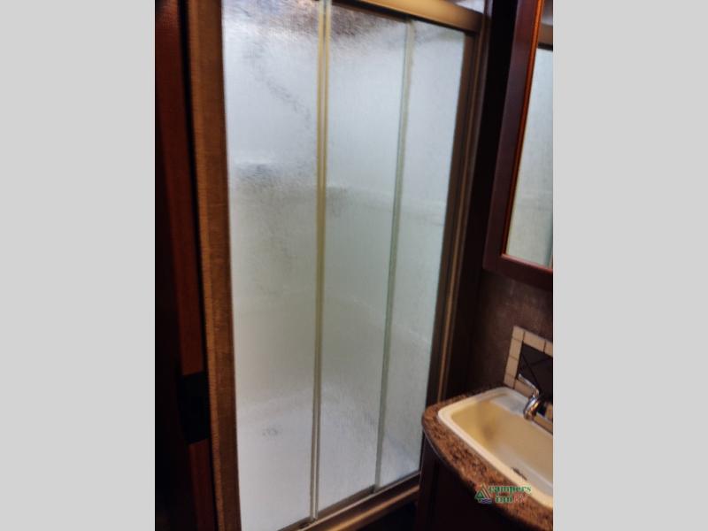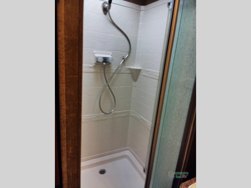 The rear full bath offers a 28" x 28" shower, long vanity with sink and overhead storage, plus a toilet.