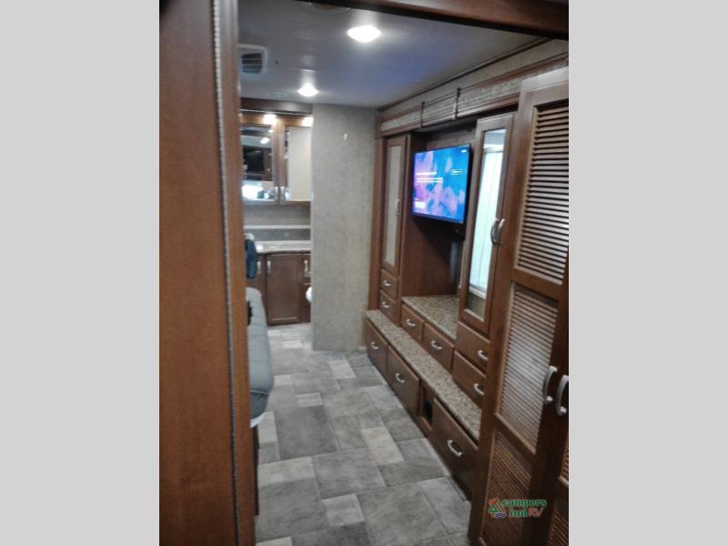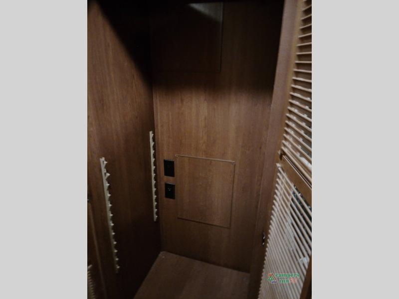The bedroom space is next and features a slide out queen size bed along the curb side that also includes nightstands. Opposite the foot of the bed there are two closets along the full wall slide and a 32" LED TV for nighttime viewing.