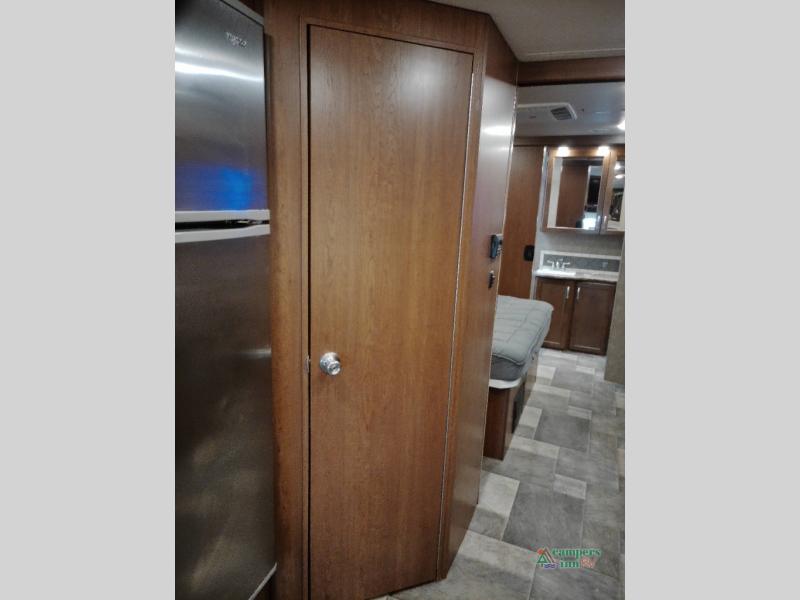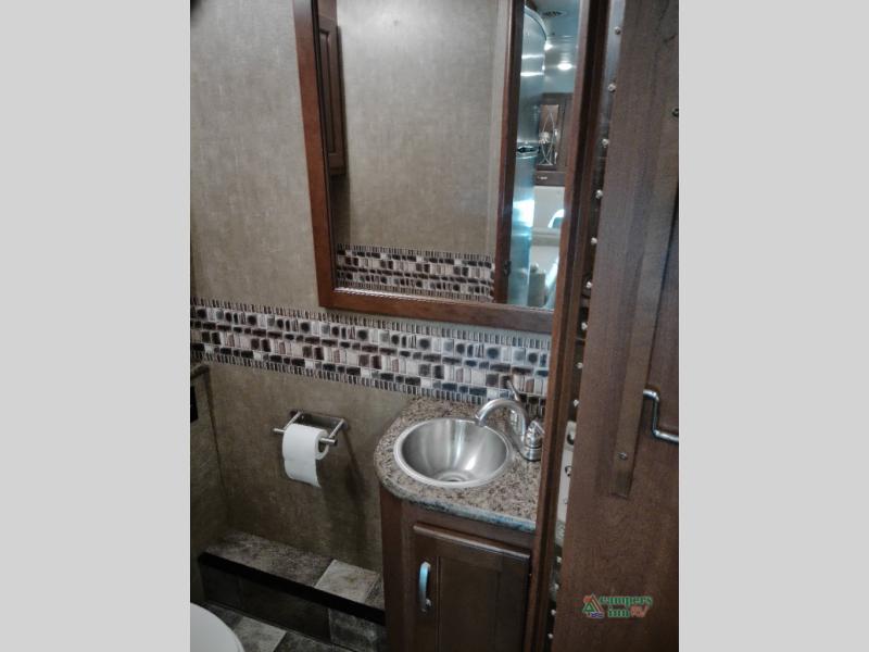 There is a half bath next to the refrigerator that includes a toilet and vanity with sink, plus overhead storage.